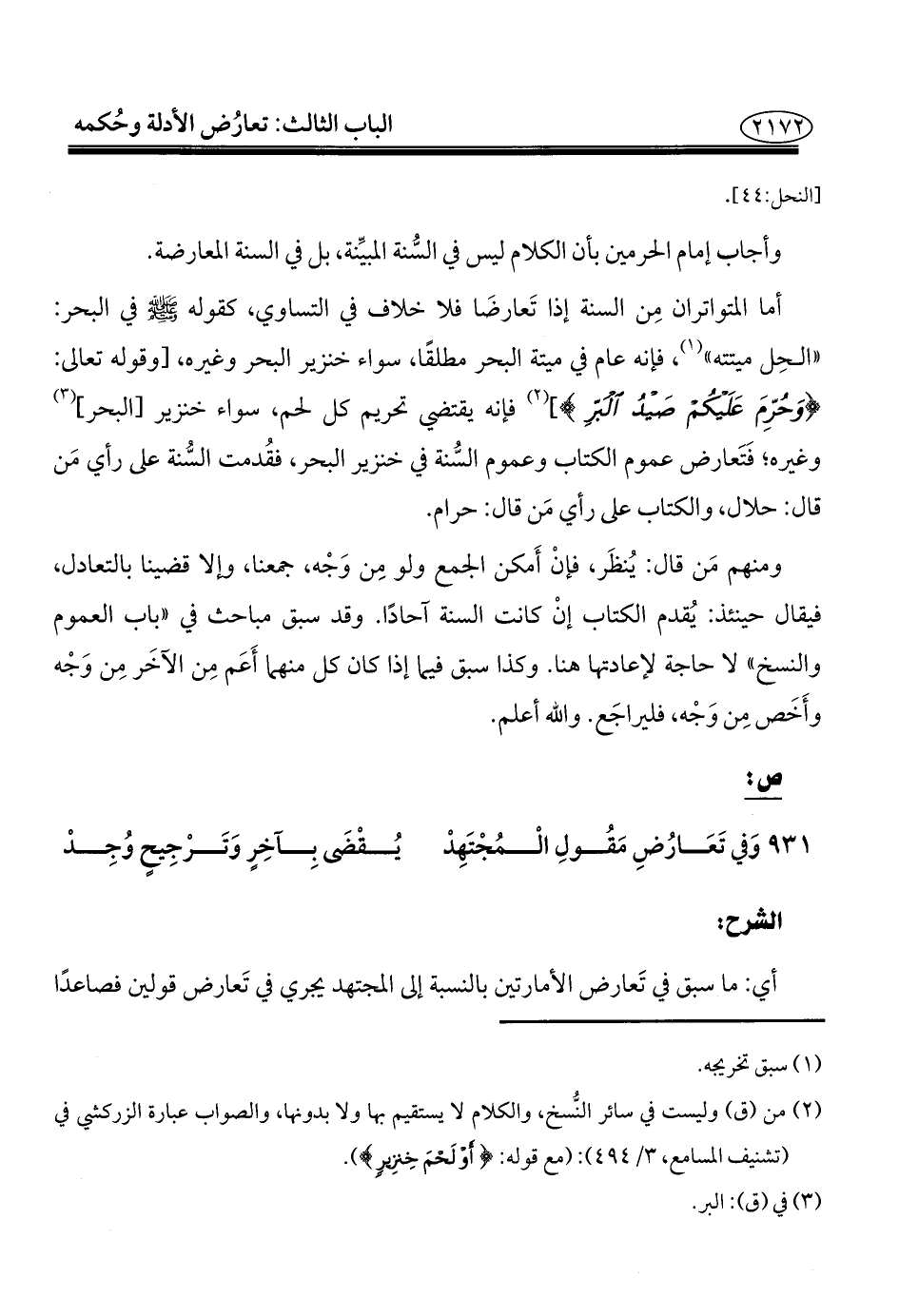 ٩٣١ - وَفي تَعَارُضِ مَقُولِ الْمُجْتَهِدْ ... يُقْضَى بِآخِرٍ وَتَرْجِيحٍ وُجِدْ