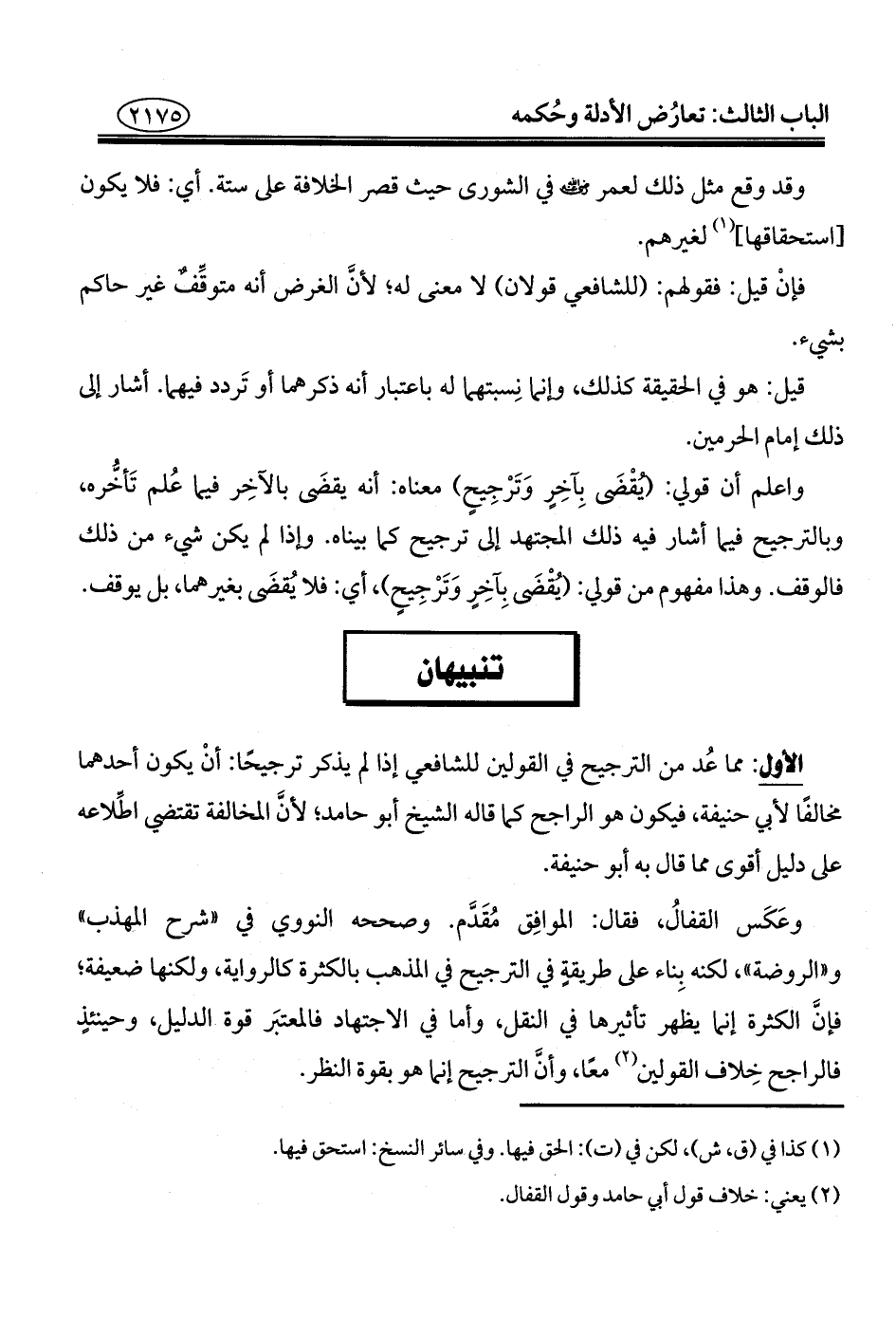 الأول: مما عُد من الترجيح في القولين للشافعي إذا لم يذكر ترجيحًا: أنْ يكون أحدهما مخالفًا لأبي حنيفة، فيكون هو الراجح كما قاله الشيخ أبو حامد؛ لأنَّ المخالفة تقتضي اطِّلاعه على دليل أقوى مما قال به أبو حنيفة.