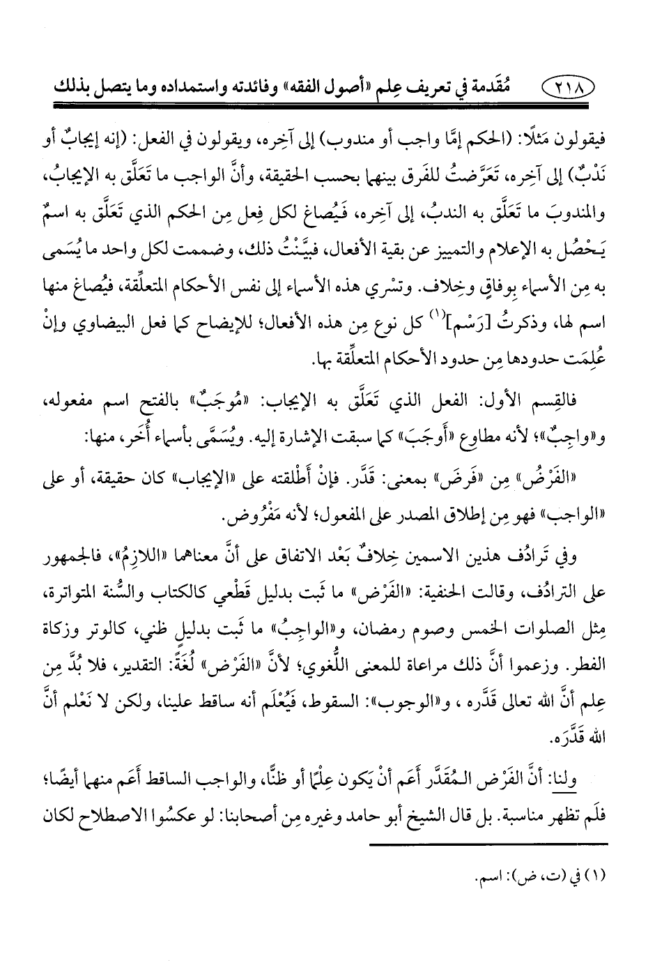 فيقولون مَثلًا: (الحكم إمَّا واجب أو مندوب) إلى آخِره، ويقولون في الفعل: (إنه إيجابٌ أو نَدْبٌ) إلى آخِره، تَعَرَّضتُ للفَرق بينهما بحسب الحقيقة، وأنَّ الواجب ما تَعَلَّق به الإيجابُ، والمندوبَ ما تَعَلَّق به الندبُ، إلى آخِره، فَيُصاغ لكل فِعل مِن الحكم الذي تَعَلَّق به اسمٌ يَحْصُل به الإعلام والتمييز عن بقية الأفعال، فبيَّنْتُ ذلك، وضممت لكل واحد ما يُسَمى به مِن الأسماء بِوفاقٍ وخِلاف. وتسْري هذه الأسماء إلى نفس الأحكام المتعلِّقة، فيُصاغ منها اسم لها، وذكرتُ [رَسْم] (¬١) كل نوع مِن هذه الأفعال؛ للإيضاح كما فعل البيضاوي وإنْ عُلِمَت حدودها مِن حدود الأحكام المتعلِّقة بها.