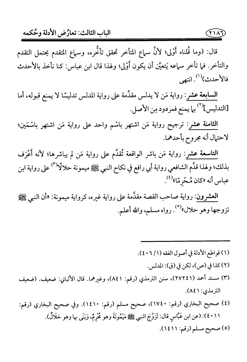 العشرون: رواية صاحب القصة مقدَّمة على رواية غيره، كرواية ميمونة: "أن النبي - صلى الله عليه وسلم - تزوجها وهو حلال" (¬٥). رواه مسلم، والله أعلم.