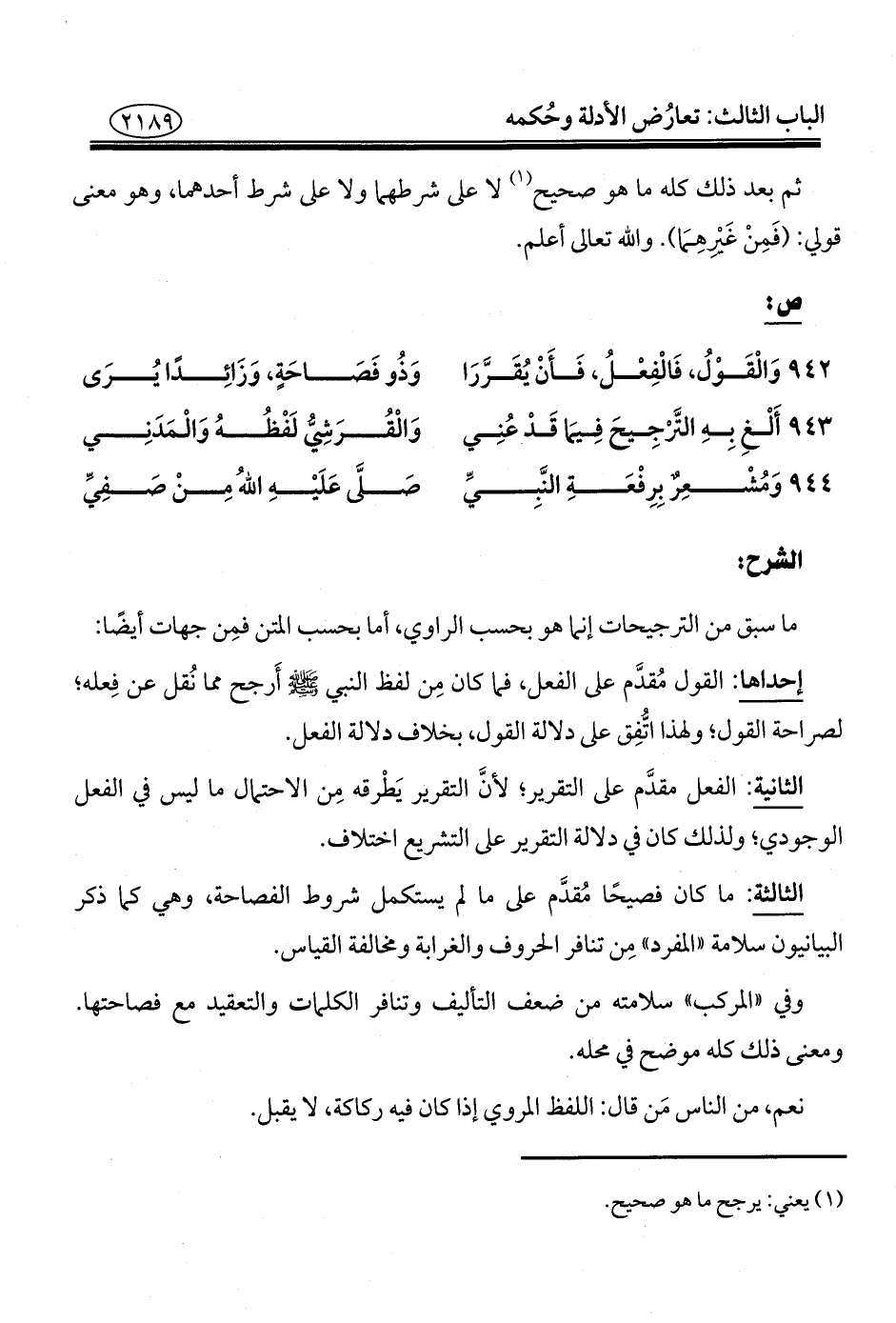 ٩٤٢ - وَالْقَوْلُ، فَالْفِعْلُ، فَأَنْ يُقَرَّرَا ... وَذُو فَصَاحَةٍ، وَزَائِدًا يُرَى