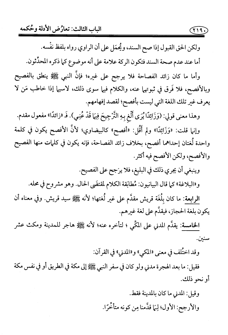 وأما ما كان زائد الفصاحة فلا يرجح على غيره؛ فإنَّ النبي - صلى الله عليه وسلم - ينطق بالفصيح وبالأفصح، فلا فَرق في ثبوتهما عنه، والكلام فيما سوى ذلك، لا سيما إذا خاطب مَن لا يعرف غير تلك اللغة التي ليست بأفصح؛ لقصد إفهامهم.