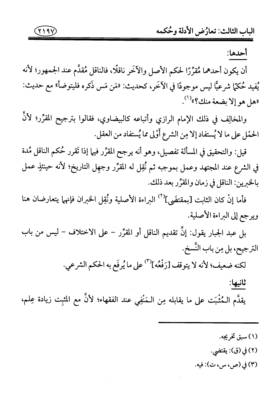 أن يكون أحدهما مُقرِّرًا لحكم الأصل والآخَر ناقلًا، فالناقل مُقدَّم عند الجمهور؛ لأنه يُفيد حُكمًا شرعيًّا ليس موجودًا في الآخَر، كحديث: "مَن مَس ذَكره فليتوضأ" مع حديث: "هل هو إلا بضعة منك؟ " (¬١).