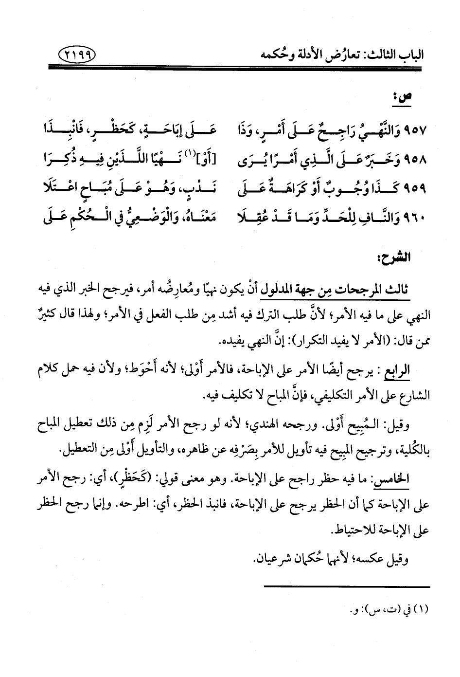 الخامس: ما فيه حظر راجح على الإباحة. وهو معنى قولي: (كَحَظْرٍ)، أي: رجح الأمر على الإباحة كما أن الحظر يرجح على الإباحة، فانبذ الحظر، أي: اطرحه. وإنما رجح الحظر على الإباحة للاحتياط.