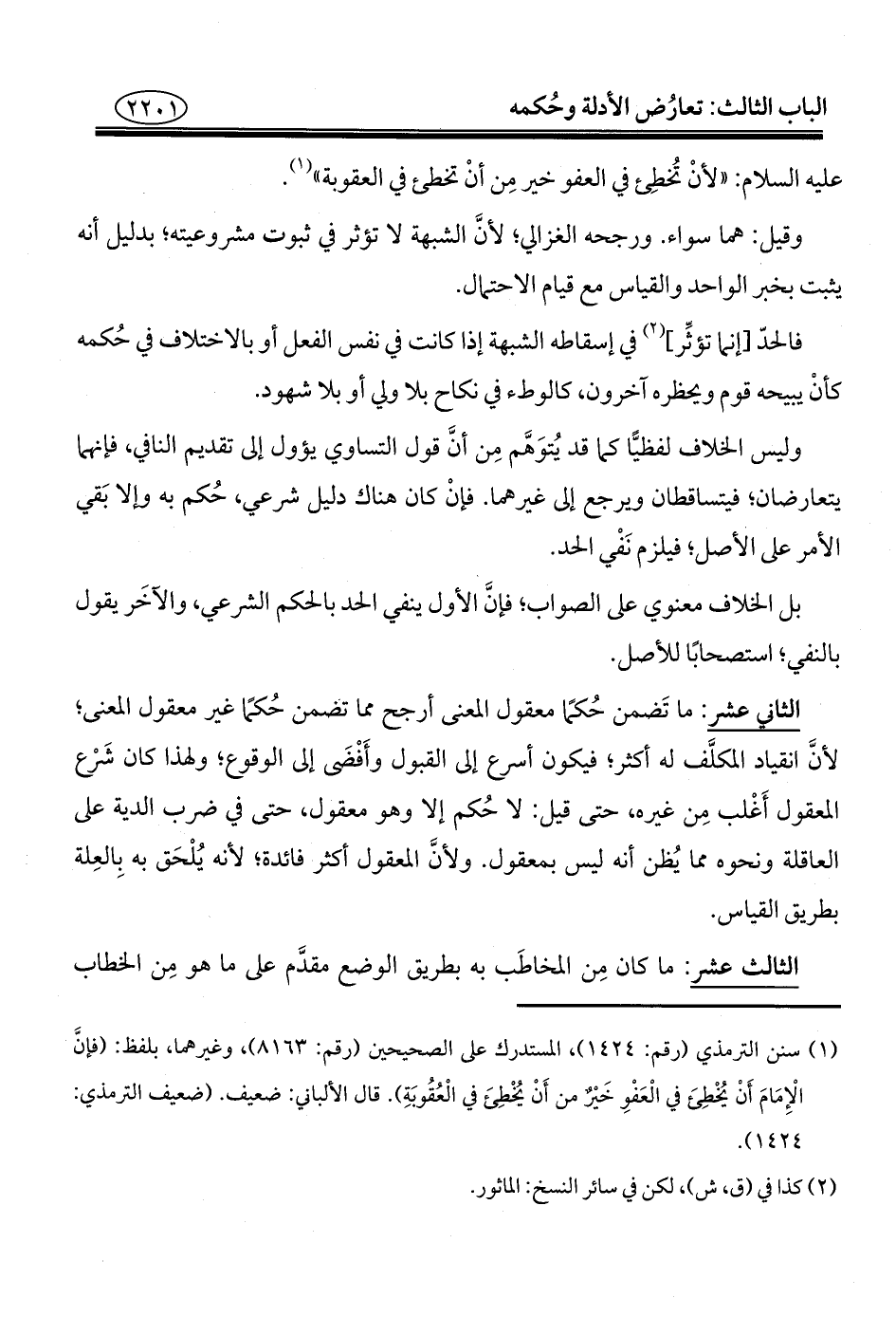 (¬١) سنن الترمذي (رقم: ١٤٢٤)، المستدرك على الصحيحين (رقم: ٨١٦٣)، وغيرهما، بلفظ: (فإنَّ الْإِمَامَ أَنْ يُخْطِئَ في الْعَفْوِ خَيْرٌ من أَنْ يُخْطِئَ في الْعُقُوبَةِ). قال الألباني: ضعيف. (ضعيف الترمذي: ١٤٢٤).