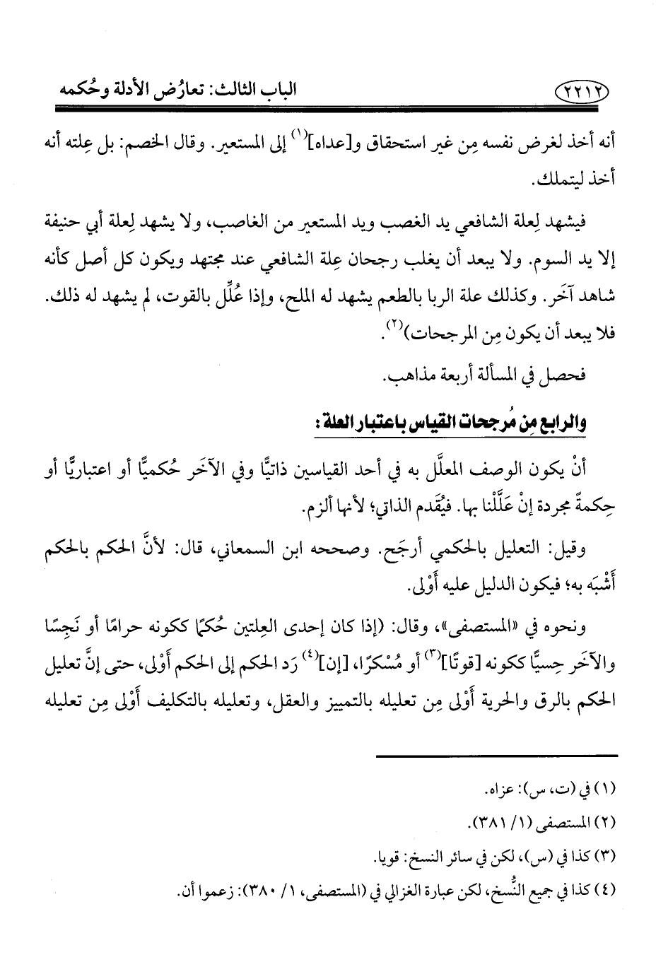 فيشهد لِعلة الشافعي يد الغصب ويد المستعير من الغاصب، ولا يشهد لِعلة أبي حنيفة إلا يد السوم. ولا يبعد أن يغلب رجحان عِلة الشافعي عند مجتهد ويكون كل أصل كأنه شاهد آخَر. وكذلك علة الربا بالطعم يشهد له الملح، وإذا عُلِّل بالقوت، لم يشهد له ذلك. فلا يبعد أن يكون مِن المرجحات) (¬٢).