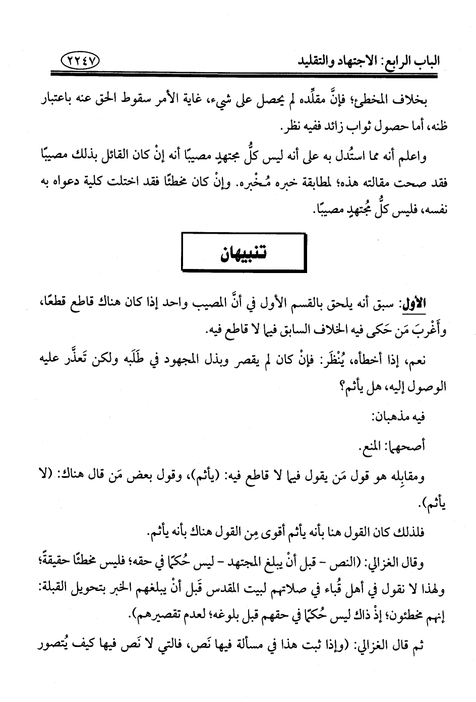 وقال الغزالي: (النص -قبل أنْ يبلغ المجتهد- ليس حُكمًا في حقه؛ فليس مخطئًا حقيقة؛ ولهذا لا نقول في أهل قُباء في صلاتهم لبيت المقدس قَبل أنْ يبلغهم الخبر بتحويل القبلة: إنهم مخطئون؛ إذْ ذاك ليس حُكمًا في حقهم قبل بلوغه؛ لعدم تقصيرهم).
