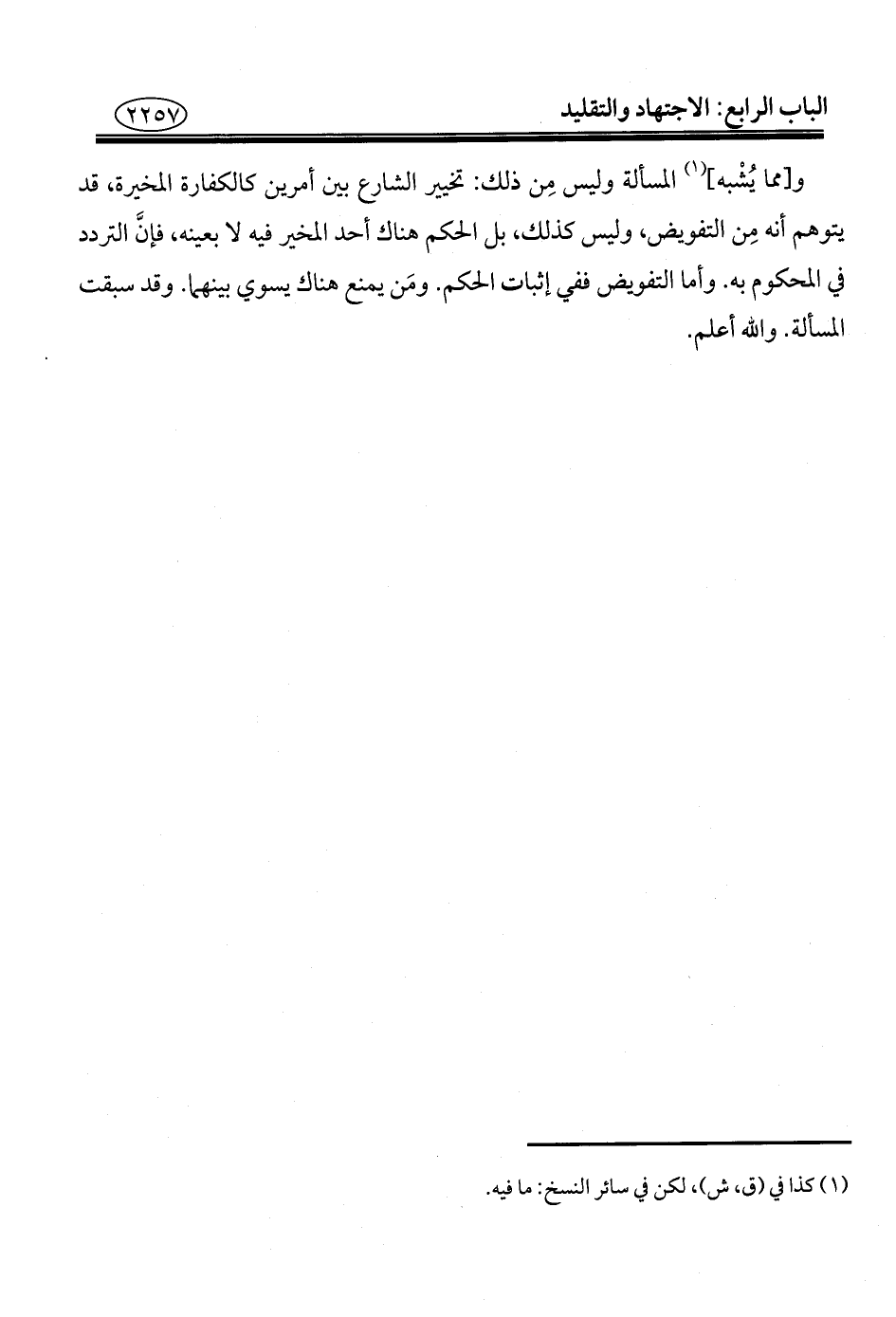و [مما يُشْبه] (¬١) المسألة وليس مِن ذلك: تخيير الشارع بين أمرين كالكفارة المخيرة، قد يتوهم أنه مِن التفويض، وليس كذلك، بل الحكم هناك أحد المخير فيه لا بعينه، فإنَّ التردد في المحكوم به. وأما التفويض ففي إثبات الحكم. ومَن يمنع هناك يسوي بينهما. وقد سبقت المسألة. والله أعلم.