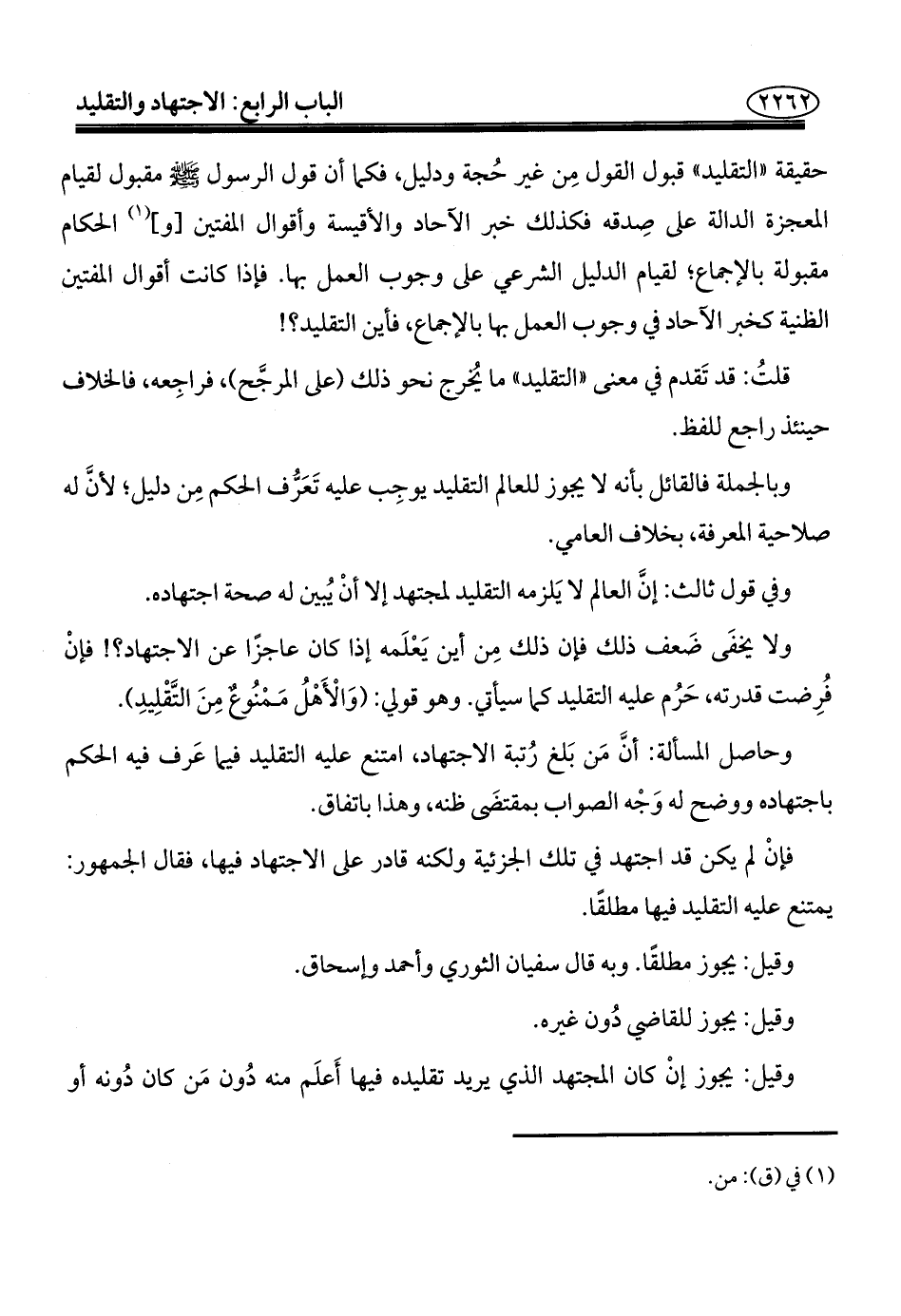 وحاصل المسألة: أنَّ مَن بَلغ رُتبة الاجتهاد، امتنع عليه التقليد فيما عَرف فيه الحكم باجتهاده ووضح له وَجْه الصواب بمقتضَى ظنه، وهذا باتفاق.