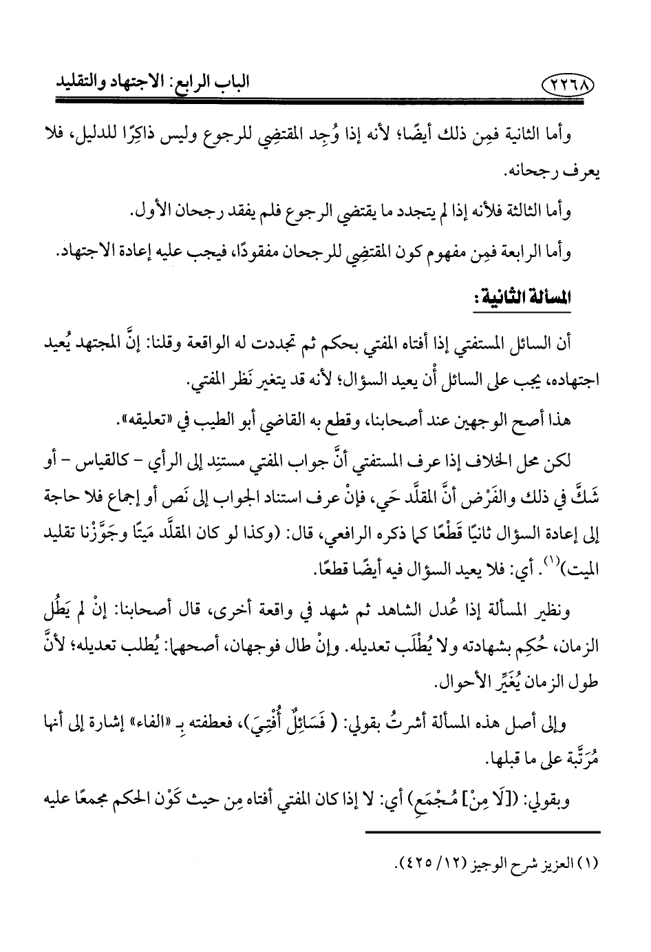 أن السائل المستفتي إذا أفتاه المفتي بحكم ثم تجددت له الواقعة وقلنا: إنَّ المجتهد يُعيد اجتهاده، يجب على السائل أْن يعيد السؤال، لأنه قد يتغير نَظر المفتي.