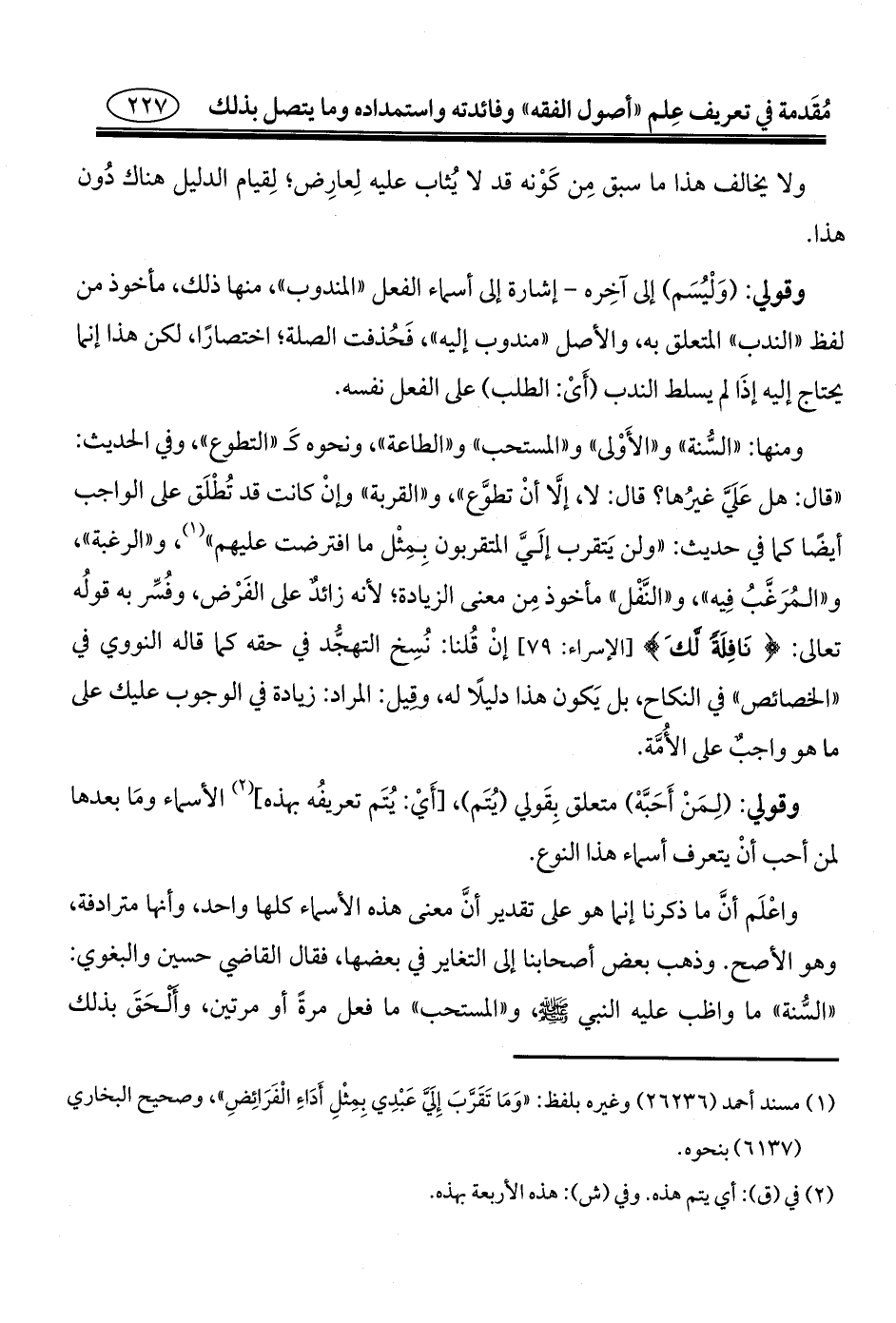 ومنها: "السُّنة" و"الأَوْلى" و"المستحب" و"الطاعة"، ونحوه كَـ "التطوع"، وفي الحديث: "قال: هل عَلَيَّ غيرُها؟ قال: لا، إلَّا أنْ تطوَّع"، و"القربة" وإنْ كانت قد تُطْلَق على الواجب أيضًا كما في حديث: "ولن يَتقرب إلَيَّ المتقربون بِمِثْل ما افترضت عليهم" (¬١)، و"الرغبة"، و"المُرَغَّبُ فِيه"، و"النَّفْل" مأخوذ مِن معنى الزيادة؛ لأنه زائدٌ على الفَرْض، وفُسِّر به قولُه تعالى: {نَافِلَةً لَكَ} [الإسراء: ٧٩] إنْ قُلنا: نُسِخ التهجُّد في حقه كما قاله النووي في "الخصائص" في النكاح، بل يَكون هذا دليلًا له، وقِيل: المراد: زيادة في الوجوب عليك على ما هو واجبٌ على الأُمَّة.