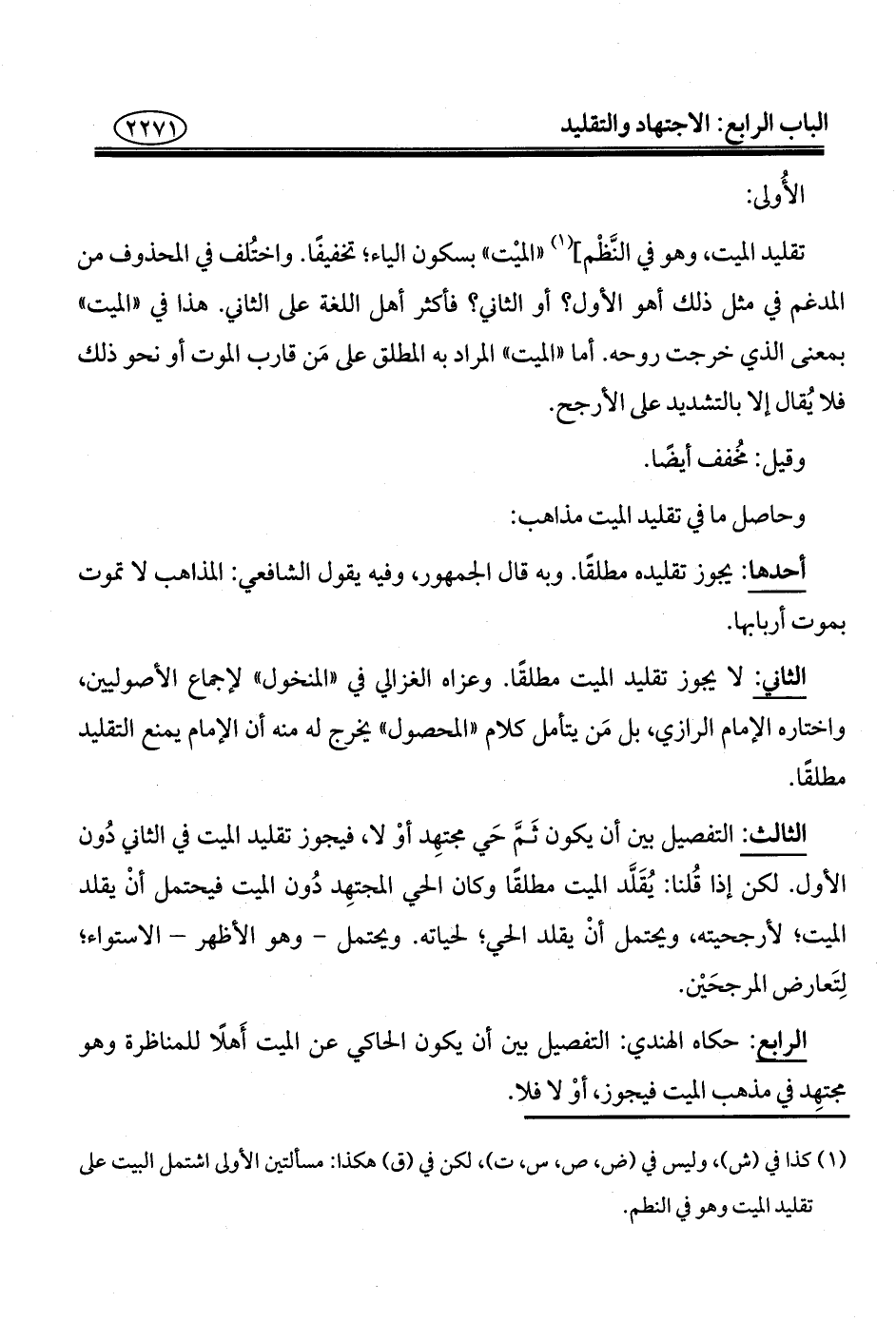 تقليد الميت، وهو في النَّظْم] (¬١) "الميْت" بسكون الياء؛ تخفيفًا. واختُلف في المحذوف من المدغم في مثل ذلك أهو الأول؟ أو الثاني؟ فأكثر أهل اللغة على الثاني. هذا في "الميت" بمعنى الذي خرجت روحه. أما "الميت" المراد به المطلق على مَن قارب الموت أو نحو ذلك فلا يُقال إلَّا بالتشديد على الأرجح.