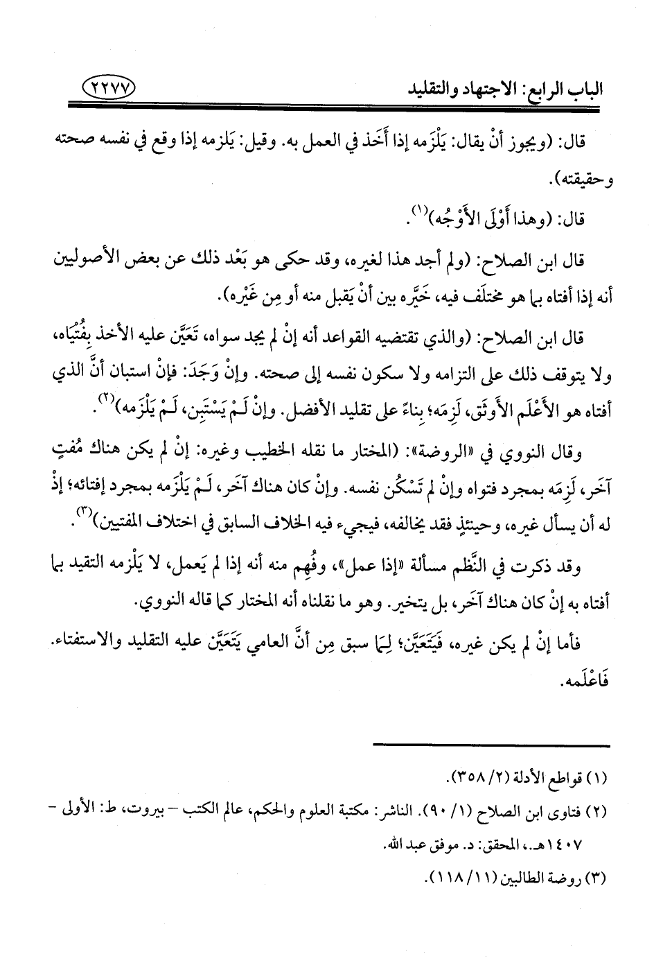وقال النووي رحمه الله في "الروضة": (المختار ما نقله الخطيب وغيره: إنْ لم يكن هناك مُفتٍ آخَر، لَزِمَه بمجرد فتواه وإنْ لم تَسْكُن نفسه. وإنْ كان هناك آخَر، لَمْ يَلْزَمه بمجرد إفتائه؛ إذْ له أن يسأل غيره، وحينئذٍ فقد يخالفه، فيجيء فيه الخلاف السابق في اختلاف المفتيين) (¬٣).
