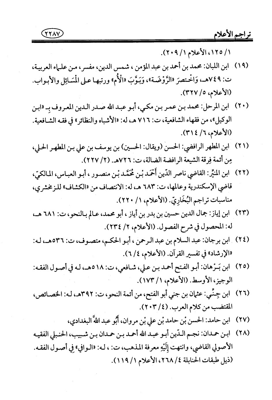 ٢٦ - ابن جِنِّي: عثمان بن جني أَبو الفتح، من أئمة النحو، ت: ٣٩٢ هـ، له: الخصائص، المقتضب من كلام العرب. (٤/ ٢٠٣).
