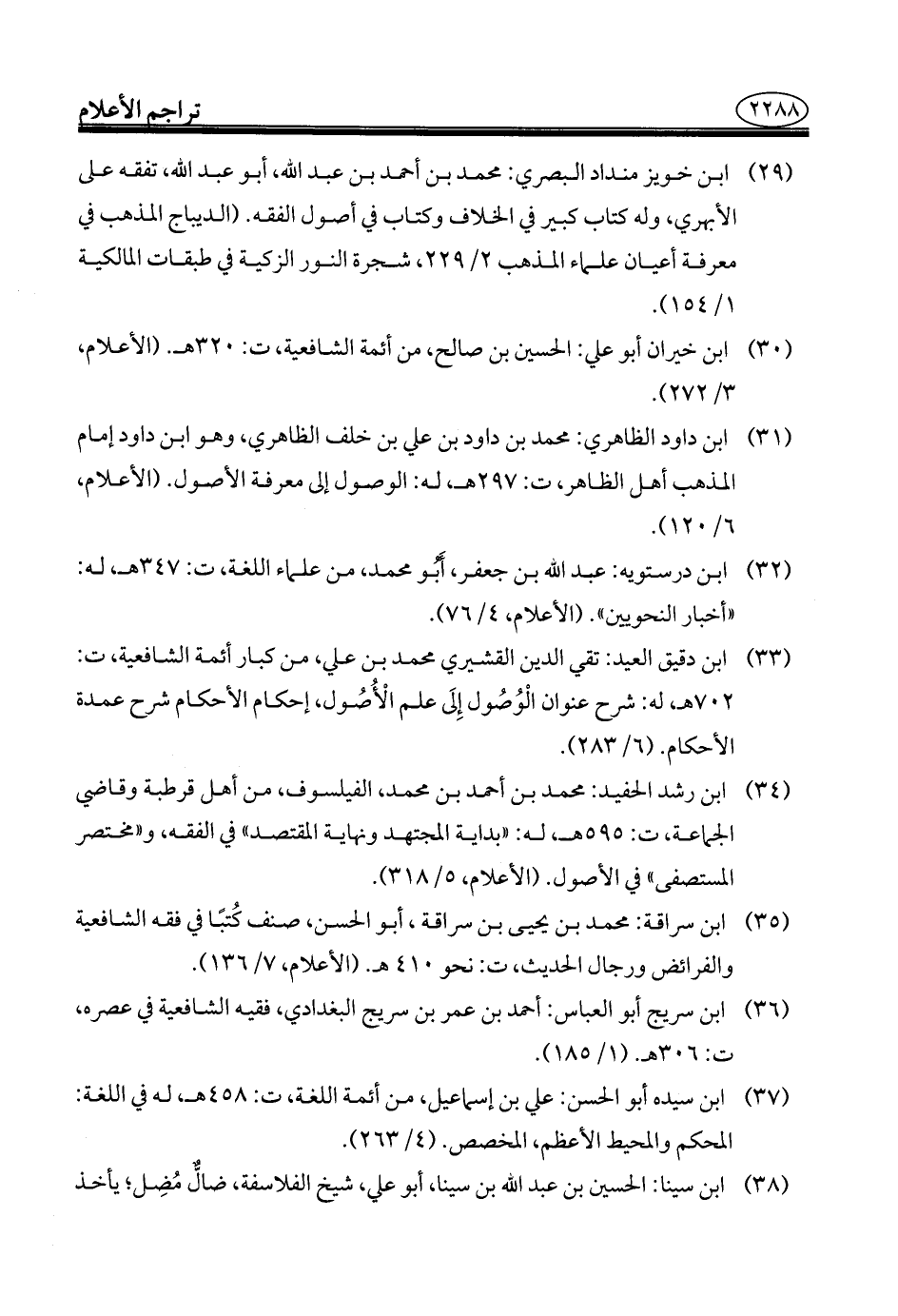 ٣١ - ابن داود الظاهري: محمد بن داود بن علي بن خلف الظاهري، وهو ابن داود إمام المذهب أهل الظاهر، ت: ٢٩٧ هـ، له: الوصول إلى معرفة الأصول. (الأعلام، ٦/ ١٢٠).