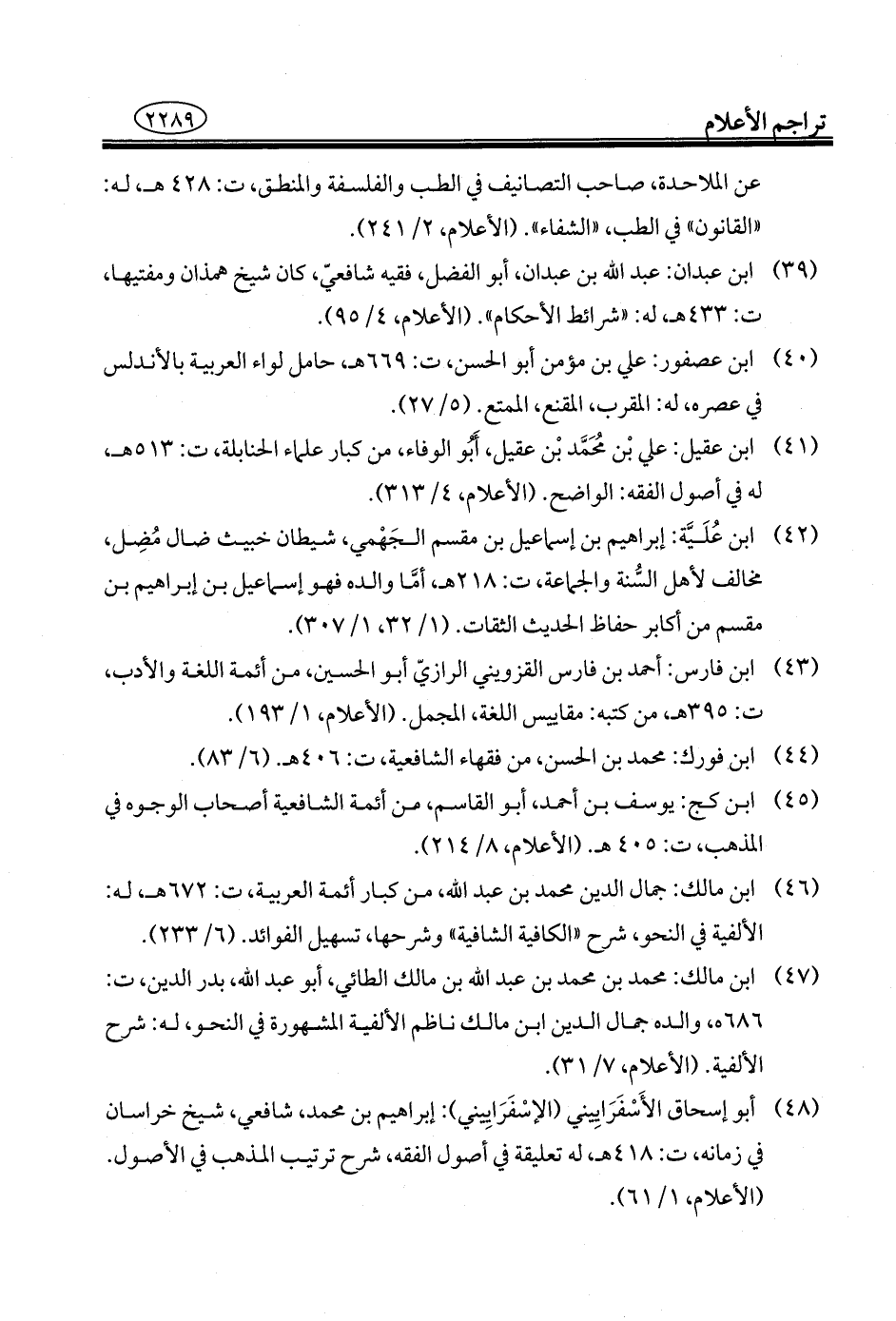 ٤٠ - ابن عصفور: علي بن مؤمن أَبو الحسن، ت: ٦٦٩ هـ، حامل لواء العربية بالأندلس في عصره، له: المقرب، المقنع، الممتع. (٥/ ٢٧).