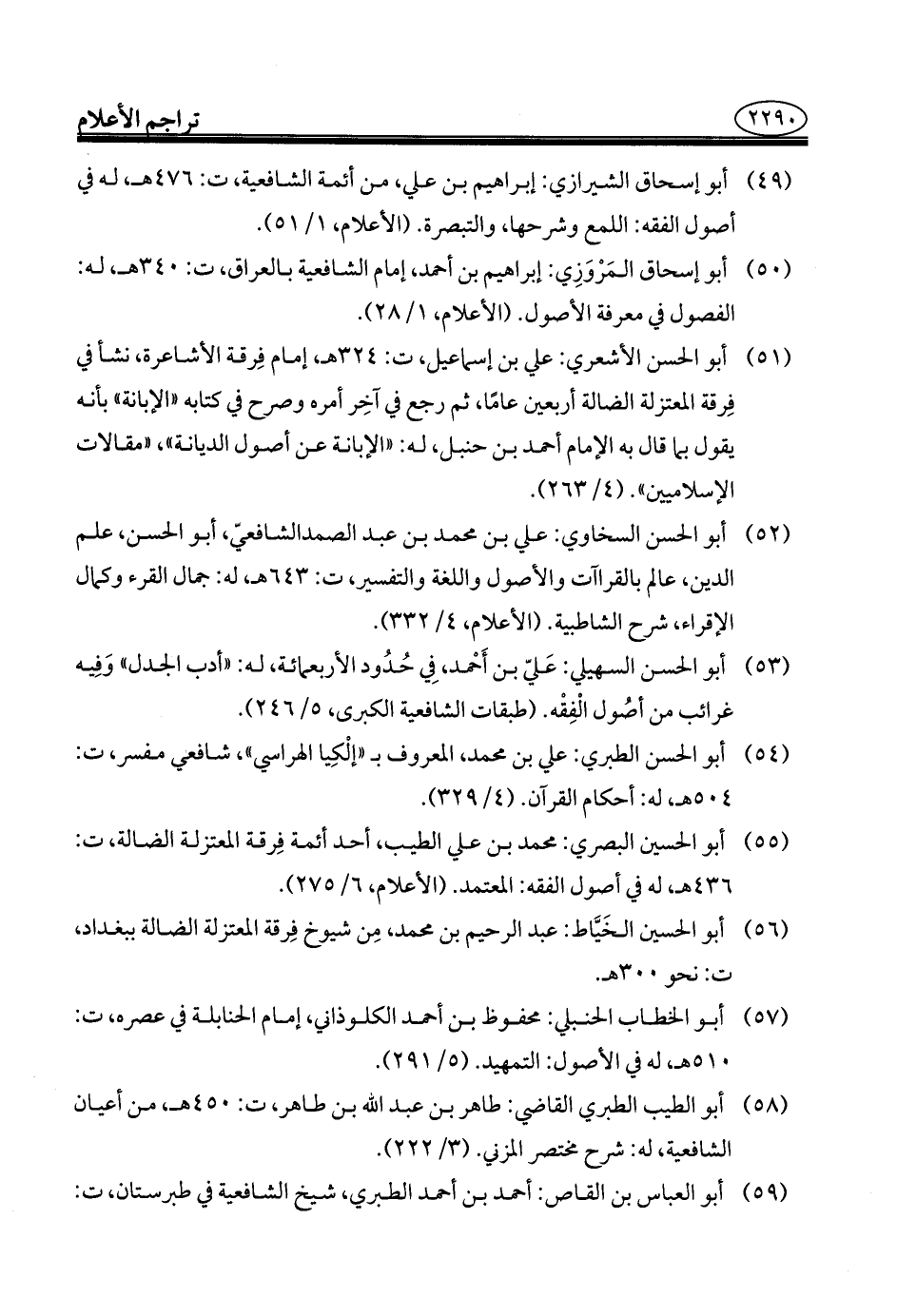 ٤٩ - أَبو إسحاق الشيرازي: إبراهيم بن علي، من أئمة الشَّافعية، ت: ٤٧٦ هـ، له في أصول الفقه: اللمع وشرحها، والتبصرة. (الأعلام، ١/ ٥١).