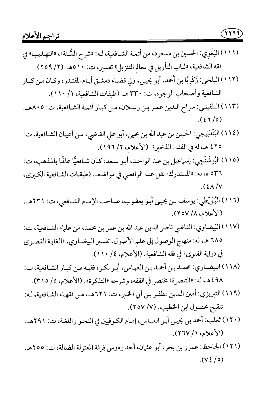 ١١٧ - البَيضاوي: القاضي ناصر الدين عبد الله بن عمر بن محمد، من علماء الشَّافعية، ت: ٦٨٥ هـ، له: منهاج الوصول إلى علم الأصول، تفسير البيضاوي، "الغاية القصوى في دراية الفتوى" في فقه الشَّافعية. (الأعلام، ٤/ ١١٠).