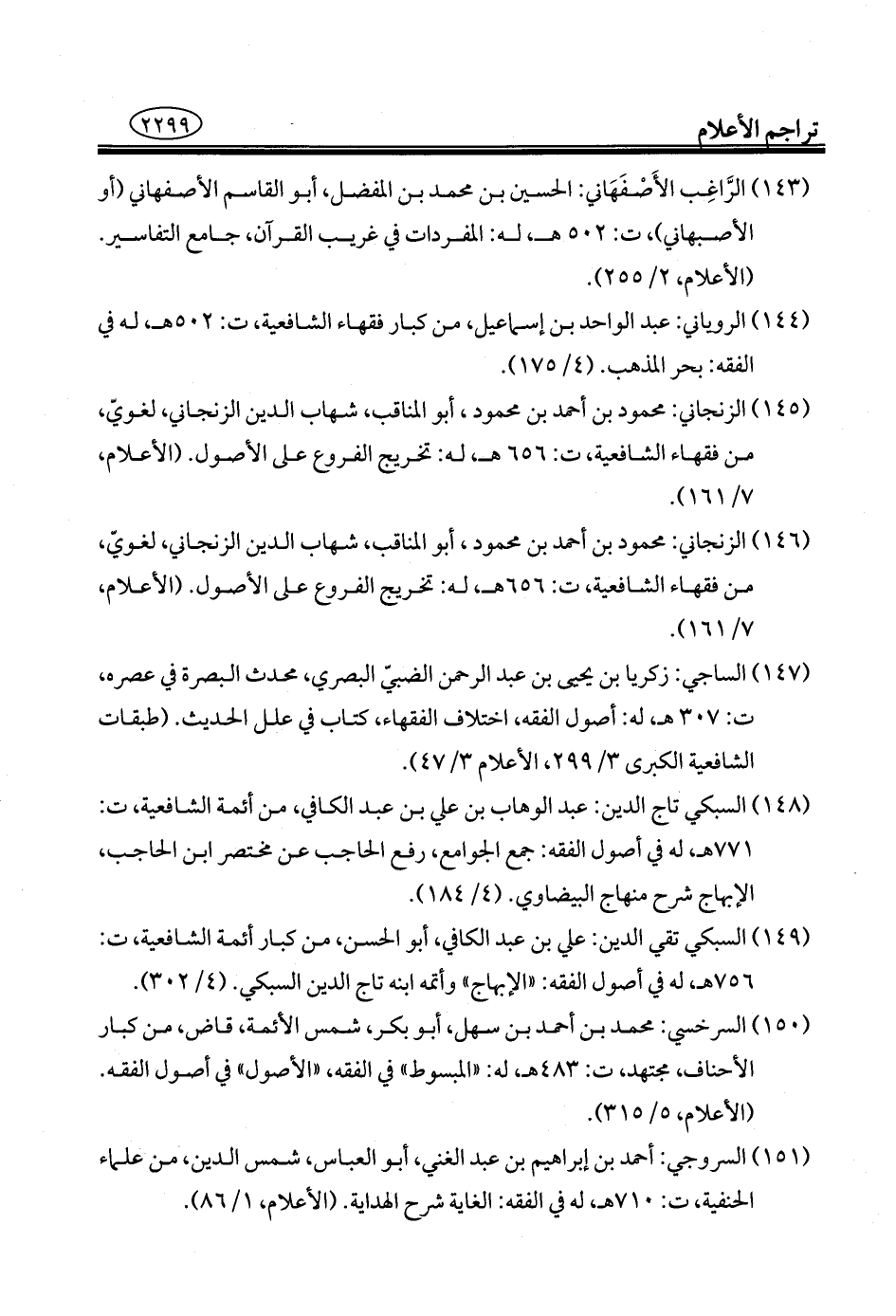 ١٤٧ - الساجي: زكريا بن يحيى بن عبد الرحمن الضبيّ البصري، محدث البصرة في عصره، ت: ٣٠٧ هـ، له: أصول الفقه، اختلاف الفقهاء، كتاب في علل الحديث. (طبقات الشَّافعية الكبرى ٣/ ٢٩٩، الأعلام ٣/ ٤٧).