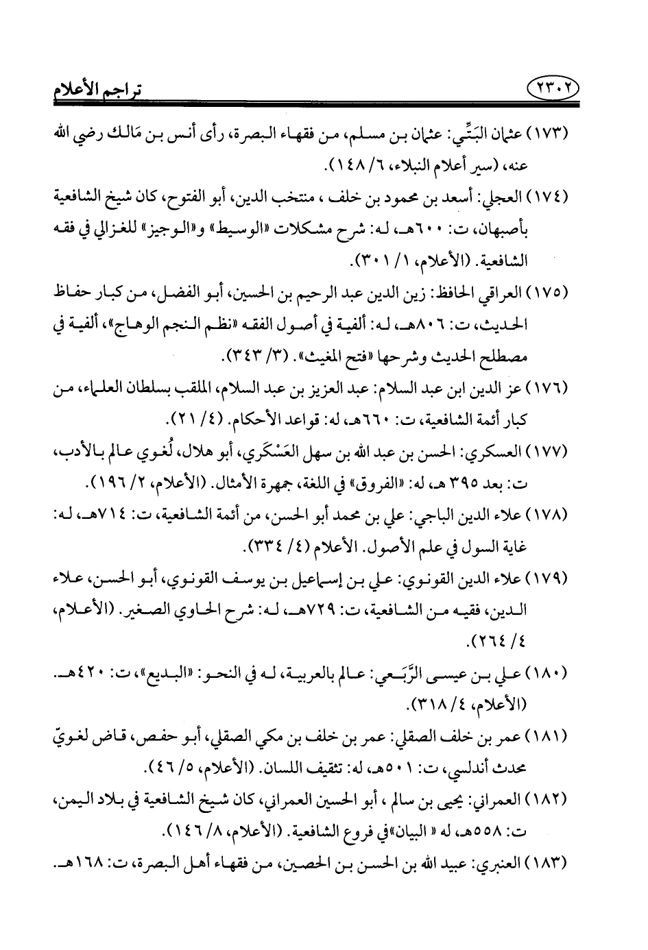 ١٨٢ - العمراني: يحيى بن سالم، أَبو الحسين العمراني، كان شيخ الشَّافعية في بلاد اليمن، ت: ٥٥٨ هـ، له "البيان" في فروع الشَّافعية. (الأعلام، ٨/ ١٤٦).