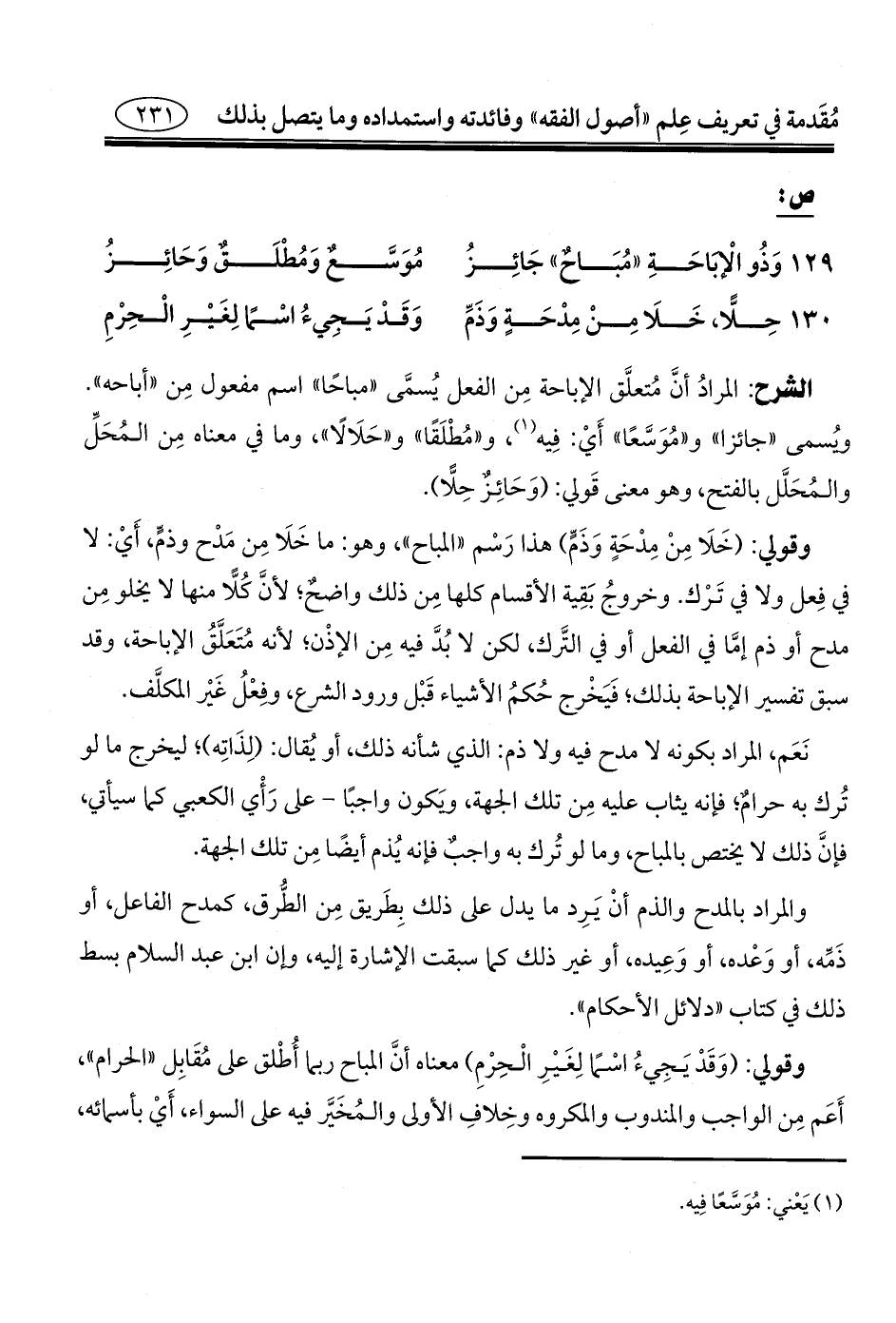 ١٢٩ - وَذُو الْإبَاحَةِ "مُبَاحٌ" جَائِزُ ... مُوَسَّعٌ وَمُطْلَقٌ وَحَائِزُ