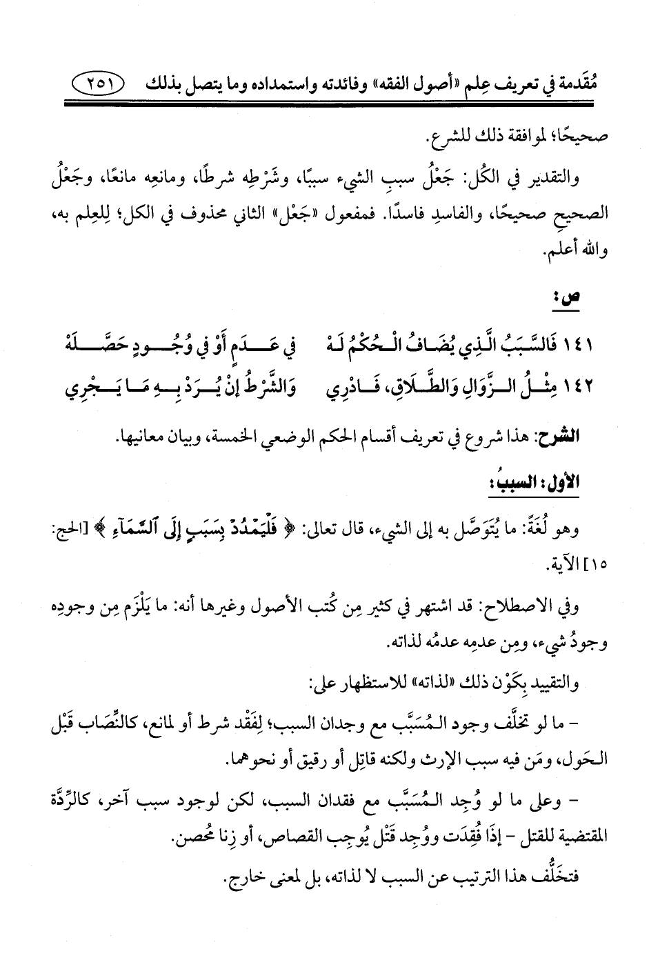 ١٤١ - فَالسَّبَبُ الَّذِي يُضَافُ الْحُكْمُ لَهْ ... في عَدَمٍ أَوْ في وُجُودٍ حَصَّلَهْ
