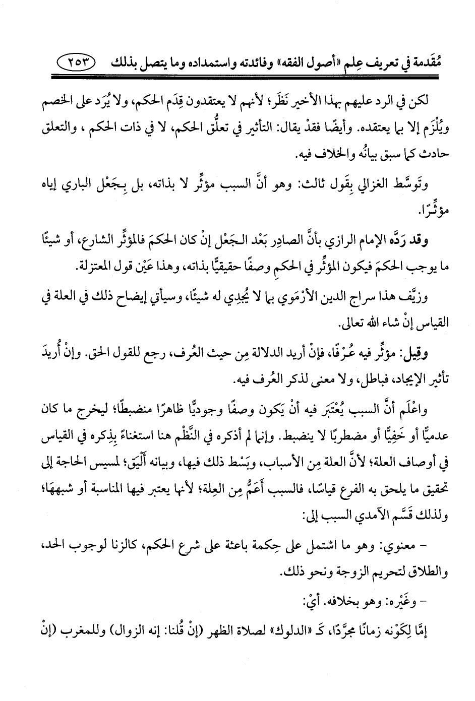 واعْلَم أنَّ السبب يُعْتَبَر فيه أنْ يَكون وصفًا وجوديًّا ظاهرًا منضبطًا؛ ليخرج ما كان عدميًّا أو خَفِيًّا أو مضطربًا لا ينضبط. وإنما لم أذكره في النَّظْم هنا استغناءً بِذِكره في القياس في أوصاف العلة؛ لأنَّ العلة مِن الأسباب، وبَسْط ذلك فيها، وبيانه أَلْيَق؛ لمسيس الحاجة إلى تحقيق ما يلحق به الفرع قياسًا، فالسبب أَعَمُّ مِن العِلة؛ لأنها يعتبر فيها المناسبة أو شبههَا؛ ولذلك قَسَّم الآمدي السبب إلى: