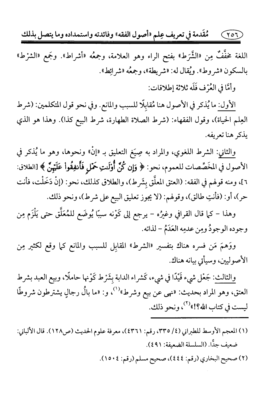 الأول: ما يُذكر في الأصول هنا مُقابِلًا للسبب والمانع. وفي نحو قول المتكلمين: (شرط العِلم الحياة)، وقول الفقهاء: (شرط الصلاة الطهارة، شرط البيع كذا). وهذا هو الذي يذكر هنا تعريفه.