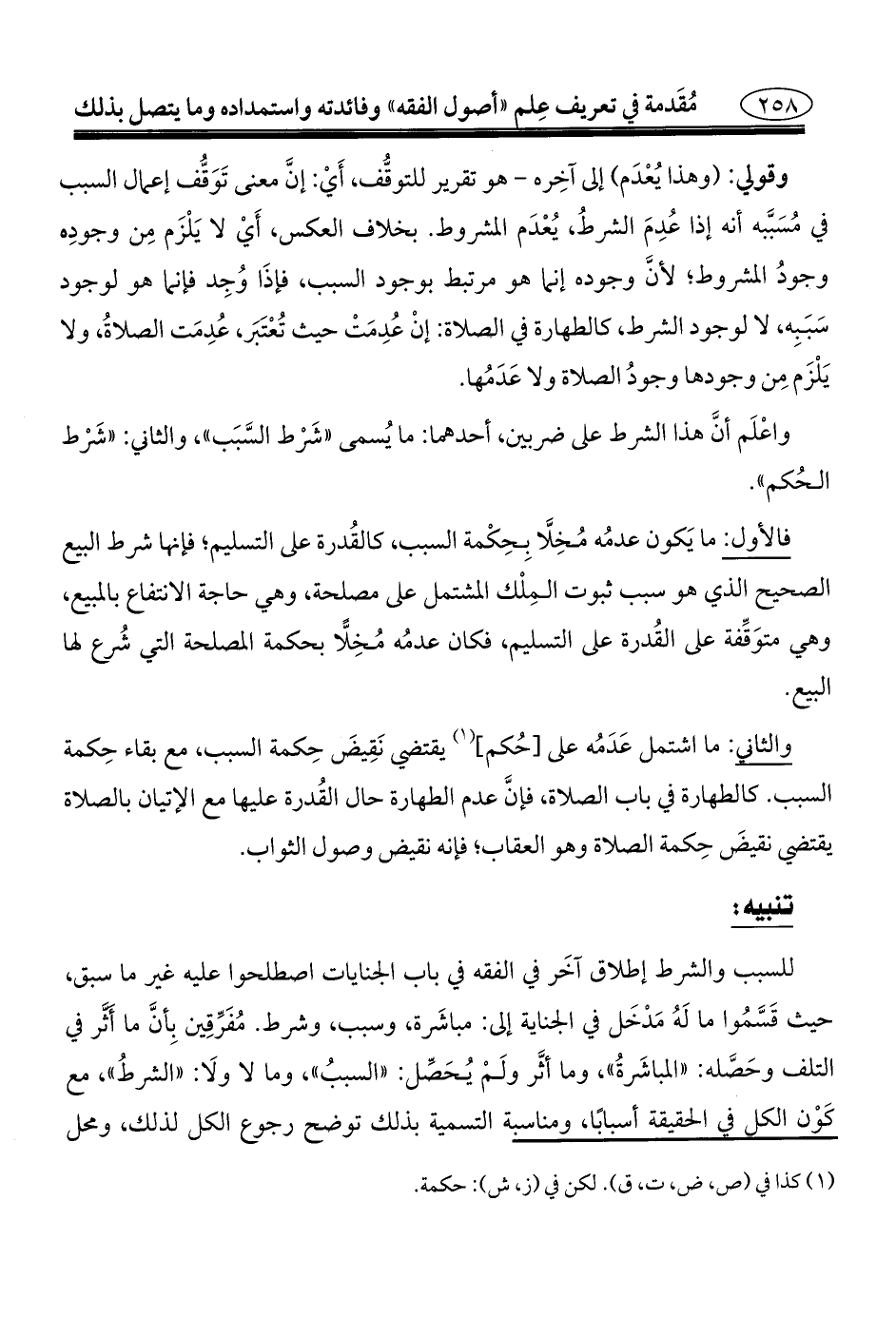 واعْلَم أنَّ هذا الشرط على ضربين، أحدهما: ما يُسمى "شَرْط السَّبَب"، والثاني: "شَرْط الحُكم".