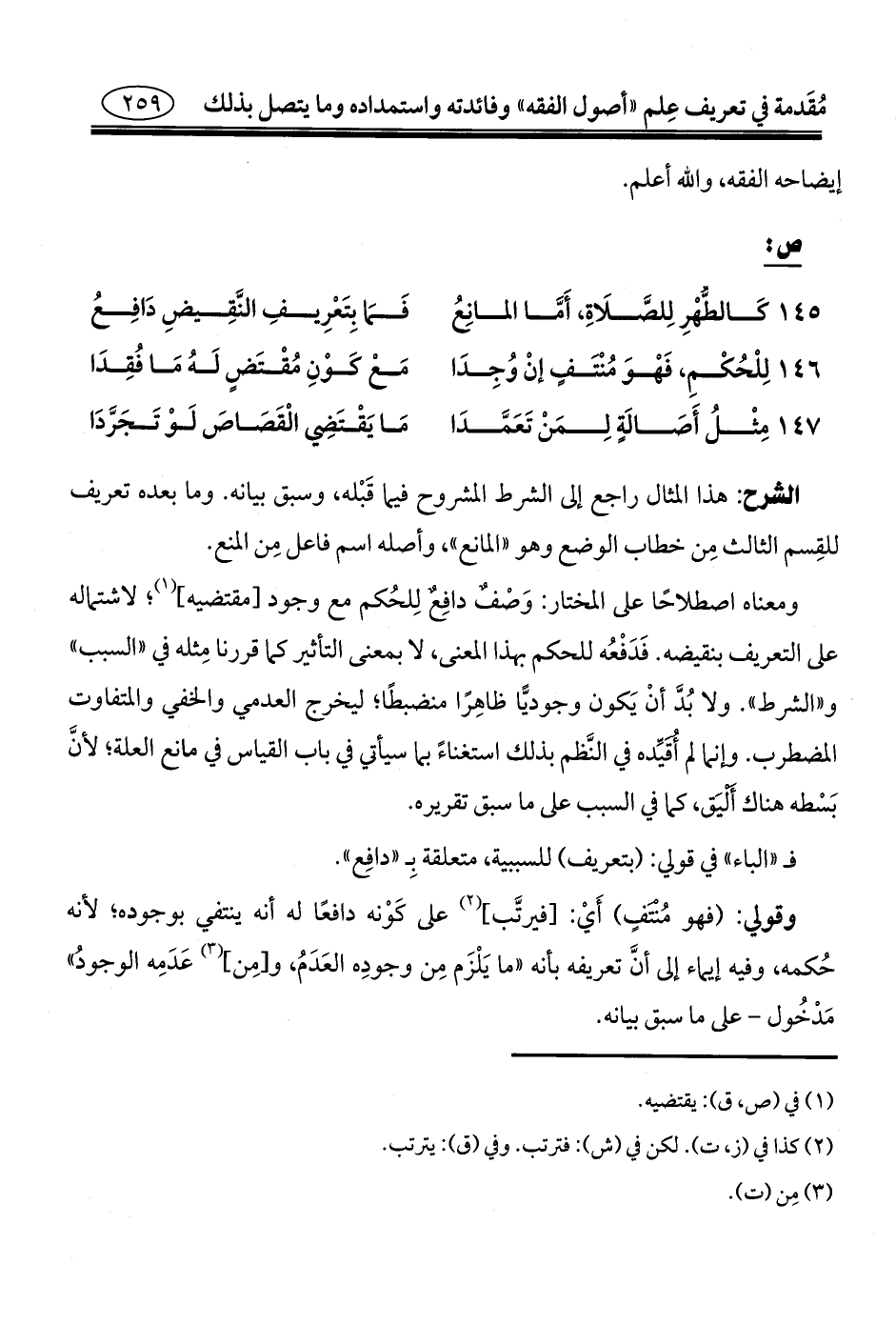 ١٤٥ - كَالطُّهْرِ لِلصَّلَاةِ، أَمَّا المانِعُ ... فَمَا بِتَعْرِيفِ النَّقِيضِ دَافِعُ