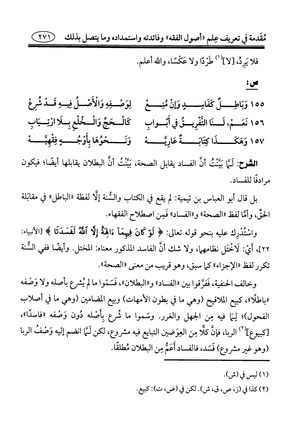 الشرح: لَمَّا بَيَّنْتُ أنَّ الفساد يقابل الصحة، بَيَّنْتُ أنَّ البطلان يقابلها أيضًا؛ فيكون مرادفًا للفساد.