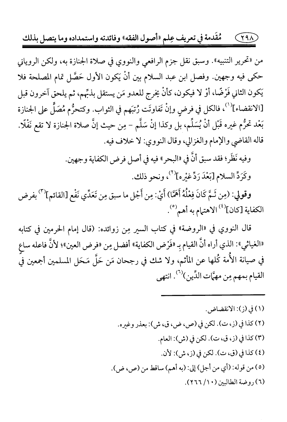 قال النووي في "الروضة" في كتاب السير مِن زوائده: (قال إمام الحرمين في كتابه "الغياثي": الذي أراه أنَّ القيام بِـ "فَرْض الكفاية" أفضل مِن "فرض العين"؛ لأنَّ فاعله ساعٍ في صيانة الأُمة كُلها عن المأثم، ولا شك في رجحان مَن حَلَّ مَحَل المسلمين أجمعين في القيام بمهم مِن مهمَّات الدِّين) (¬٦). انتهى