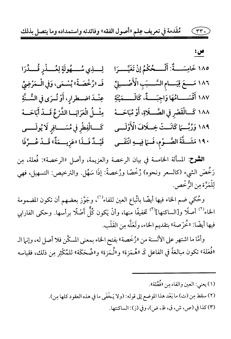 الشرح: المسألة الخامسة في بيان الرخصة والعزيمة، وأصل "الرخصة": فُعلة، مِن رَخُصَ الشيء (كالسعر ونحوه) رُخْصًا ورُخصةً: إذَا سَهُل. والترخيص: التسهيل، فهي لِلْمَرَّة مِن الرُّخْص.