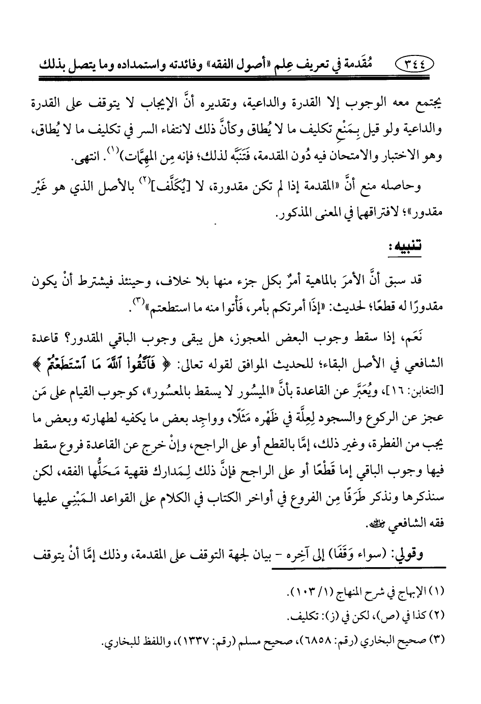 نَعَم، إذا سقط وجوب البعض المعجوز، هل يبقى وجوب الباقي المقدور؟ قاعدة الشافعي في الأصل البقاء؛ للحديث الموافق لقوله تعالى: {فَاتَّقُوا اللَّهَ مَا اسْتَطَعْتُمْ} [التغابن: ١٦]، ويُعَبَّر عن القاعدة بأنَّ "الميسُور لا يسقط بالمعسُور"، كوجوب القيام على مَن عجز عن الركوع والسجود لِعِلَّة في ظَهْره مَثَلًا، وواجِد بعض ما يكفيه لطهارته وبعض ما يجب من الفطرة، وغير ذلك، إمَّا بالقطع أو على الراجح، وإنْ خرج عن القاعدة فروع سقط فيها وجوب الباقي إما قَطْعًا أو على الراجح فإنَّ ذلك لِمَدارك فقهية مَحَلُّها الفقه، لكن سنذكرها ونذكر طَرَفًا مِن الفروع في أواخر الكتاب في الكلام على القواعد المَبْنِي عليها فقه الشافعي - رضي الله عنه -.