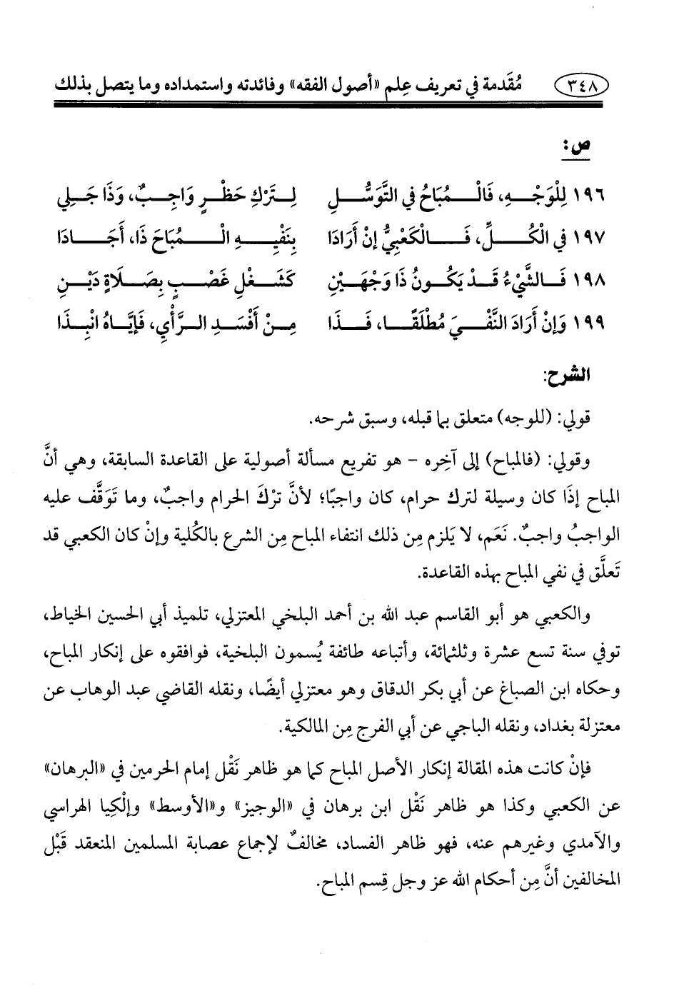 وقولي: (فالمباح) إلى آخِره -هو تفريع مسألة أصولية على القاعدة السابقة، وهي أنَّ المباح إذَا كان وسيلة لترك حرام، كان واجبًا؛ لأنَّ ترْكَ الحرام واجبٌ، وما تَوَقَّف عليه الواجبُ واجبٌ. نَعَم، لا يَلزم مِن ذلك انتفاء المباح مِن الشرع بالكُلية وإنْ كان الكعبي قد تَعلَّق في نفي المباح بهذه القاعدة.