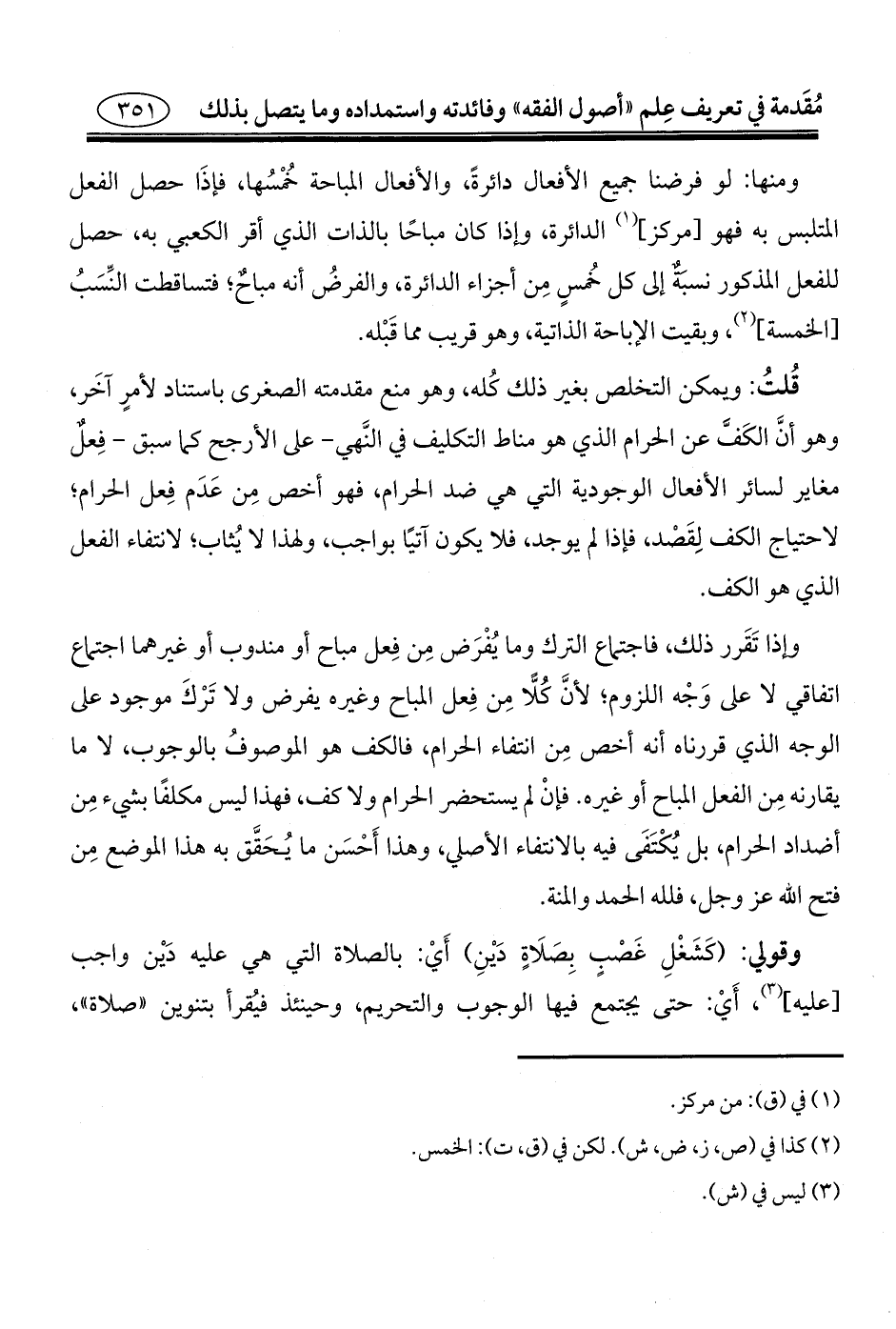 ومنها: لو فرضنا جميع الأفعال دائرةً، والأفعال المباحة خُمْسُها، فإذَا حصل الفعل المتلبس به فهو [مركز] (¬١) الدائرة، وإذا كان مباحًا بالذات الذي أقر الكعبي به، حصل للفعل المذكور نسبَةٌ إلى كل خُمسٍ مِن أجزاء الدائرة، والفرضُ أنه مباحٌ؛ فتساقطت النِّسَبُ [الخمسة] (¬٢)، وبقيت الإباحة الذاتية، وهو قريب مما قَبْله.