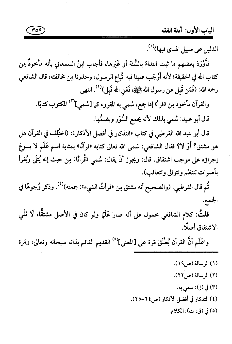 قال أبو عبد الله القرطبي في كتاب "التذكار في أفضل الأذكار": (اختُلِف في القرآن هل هو مشتق؟ أوْ لا؟ فقال الشافعي: سَمى الله تعالى كتابه "قرَآنًا" بمثابة اسم عَلَم لا يسوغ إجراؤه على موجب اشتقاق. قال: ويجوز أنْ يقال: سُمي "قُرآنًا" مِن حيث إنه يُتلَى وُيقرأ بأصوات تنتظم وتتوالى وتتعاقب).
