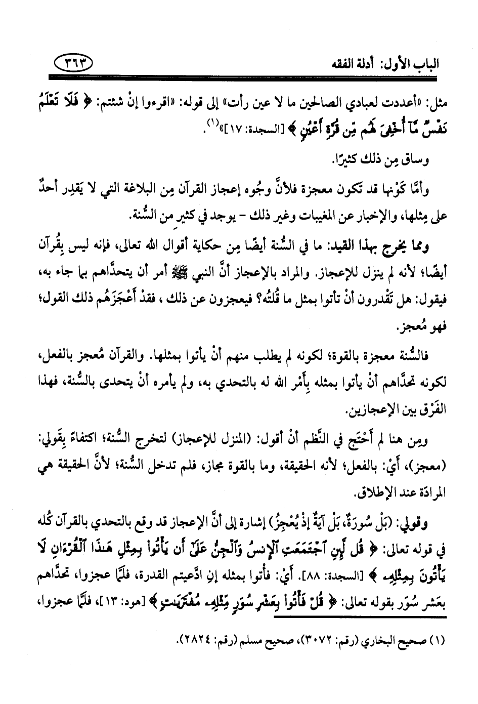 ومن هنا لم أحْتَج في النَّظم أنْ أقول: (المنزل للإعجاز) لتخرج السُّنة؛ اكتفاءً بِقَولي: (معجز)، أيْ: بالفعل؛ لأنه الحقيقة، وما بالقوة مجاز، فلم تدخل السُّنة؛ لأنُّ الحقيقة هي المرادَة عند الإطلاق.