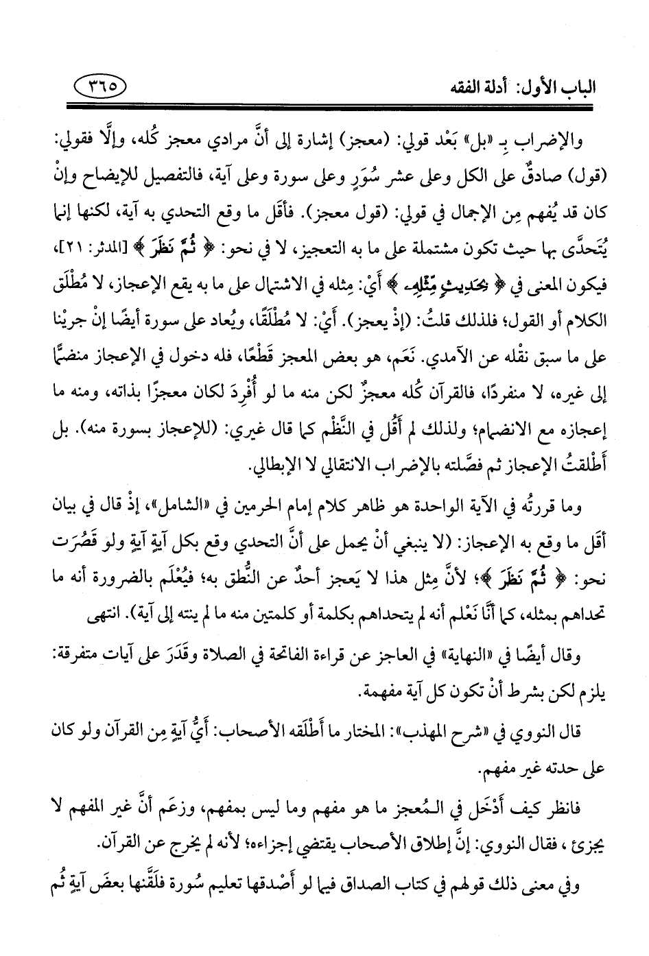 فانظر كيف أَدْخَل في المُعجز ما هو مفهم وما ليس بمفهم، وزعَم أنَّ غير المفهم لا يجزئ، فقال النووي: إنَّ إطلاق الأصحاب يقتضي إجزاءه؛ لأنه لم يخرج عن القرآن.