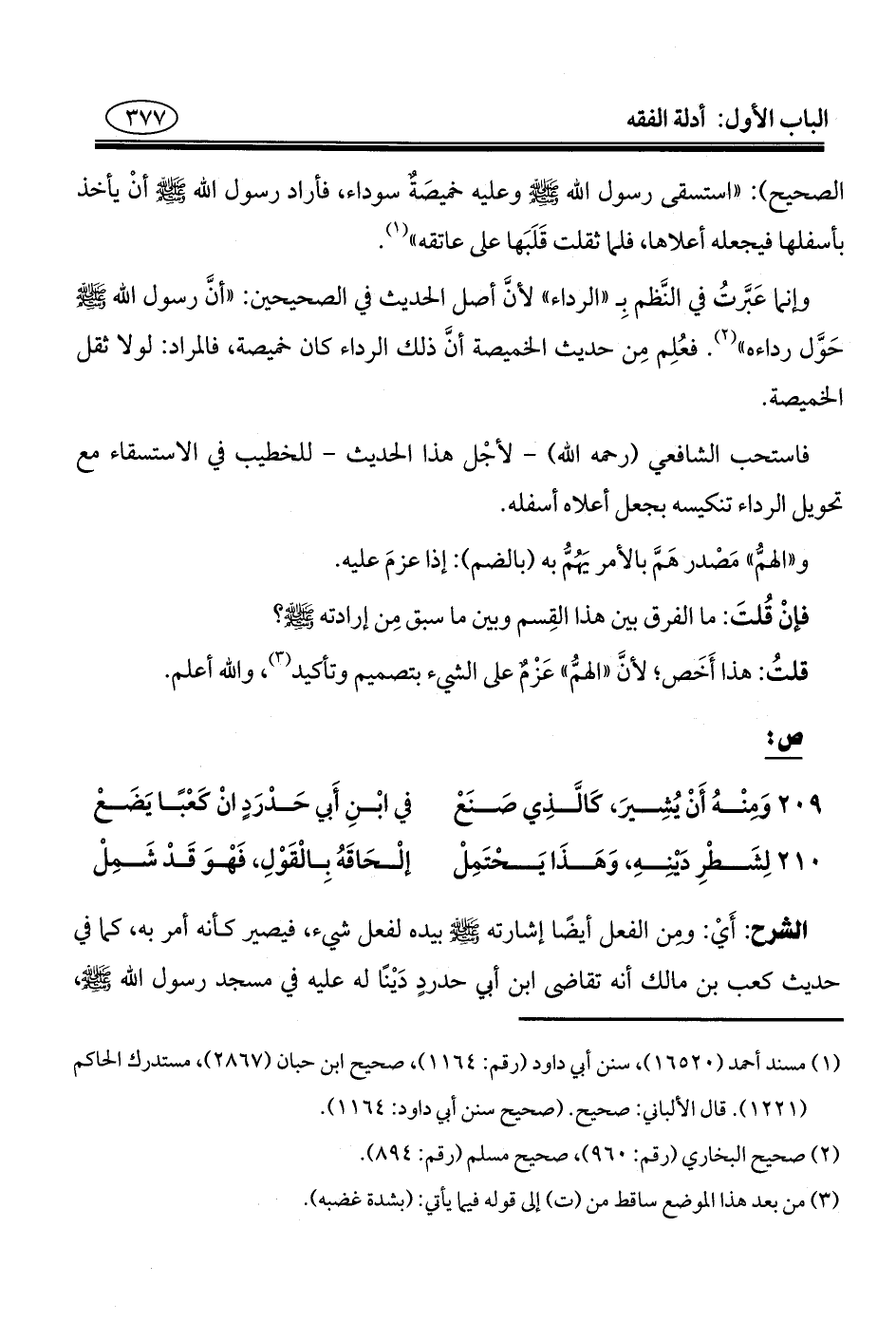 وإنما عَبَّرتُ في النَّظم بِـ "الرداء" لأنَّ أصل الحديث في الصحيحين: "أنَّ رسول الله - صلى الله عليه وسلم - حَوَّل رداءه" (¬٢). فعُلِم مِن حديث الخميصة أنَّ ذلك الرداء كان خميصة، فالمراد: لولا ثقل الخميصة.