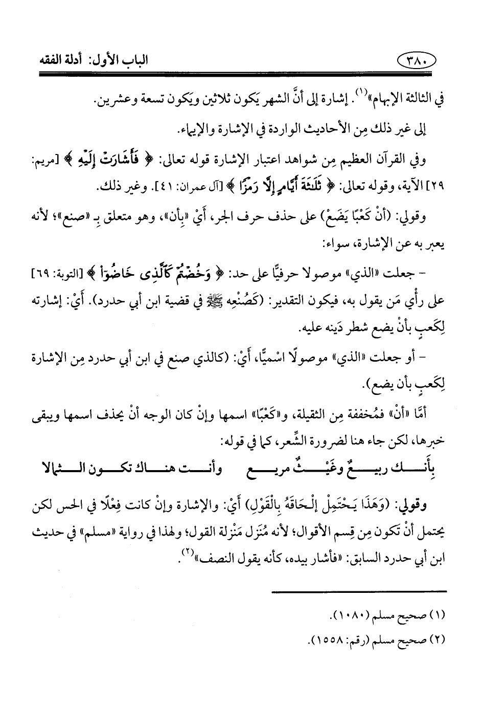وقولي: (وَهَذَا يَحْتَمِلْ إلْحَاقَهُ بِالْقَوْلِ) أَيْ: والإشارة وإنْ كانت فِعْلًا في الحس لكن يحتمل أنْ تَكون مِن قِسم الأقوال؛ لأنه مُنَزل مَنْزلة القول؛ ولهذا في رواية "مسلم" في حديث ابن أبي حدرد السابق: "فأشار بيده، كأنه يقول النصف" (¬٢).