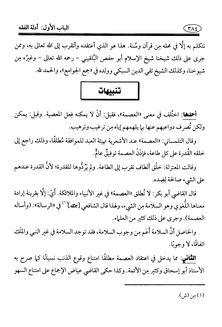 الثاني: مما يدخل في اعتقاد العصمة مطلقًا امتناع وقوع الذنب نسيانًا كما صرح به الأستاذ أبو إسحاق وكثير مِن الأئمة. وكذا حكى القاضي عياض الإجماع على امتناع السهو