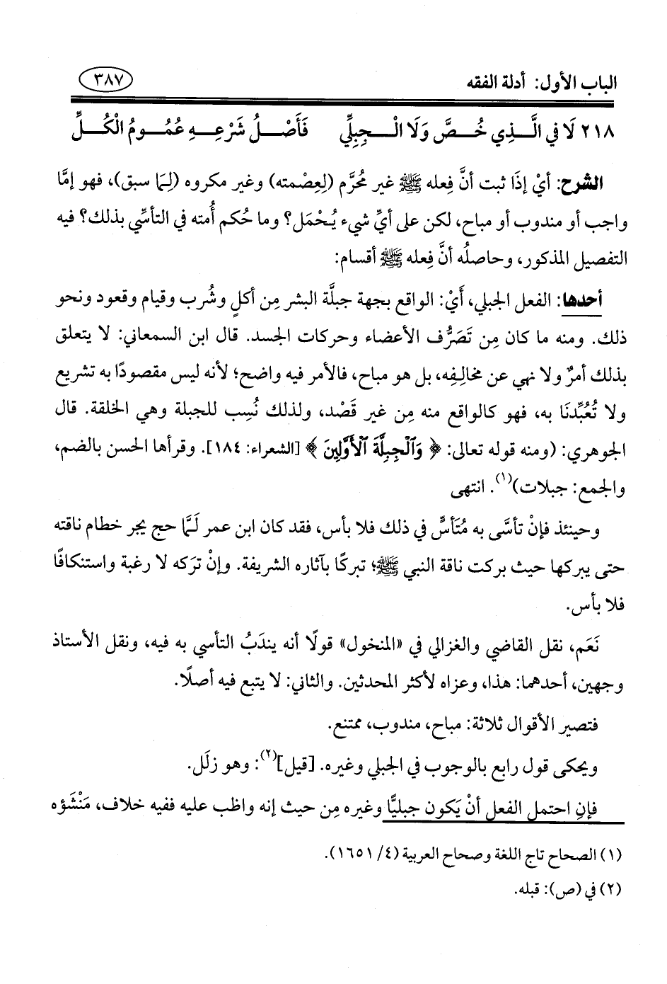 ٢١٨ - لَا في الَّذِي خُصَّ وَلَا الْجِبِلِّي ... فَأَصْلُ شَرْعِهِ عُمُومُ الْكُلِّ