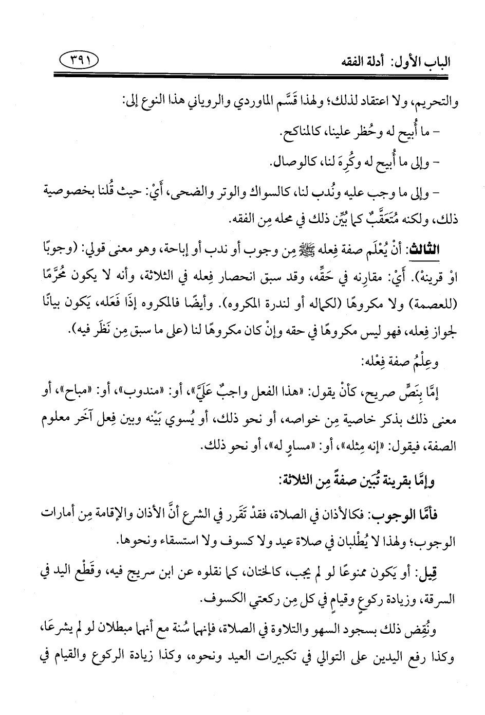 الثالث: أنْ يُعْلَم صفة فِعله - صلى الله عليه وسلم - مِن وجوب أو ندب أو إباحة، وهو معنى قولي: (وجوبًا أَوْ قرينهْ). أَيْ: مقارِنه في حَقِّه، وقد سبق انحصار فِعله في الثلاثة، وأنه لا يكون محُرَّمًا (للعصمة) ولا مكروهًا (لكماله أو لندرة المكروه). وأيضًا فالمكروه إذًا فَعَله، يَكون بيانًا لجواز فِعله، فهو ليس مكروهًا في حقه وإنْ كان مكروهًا لنا (على ما سبق مِن نَظَر فيه).