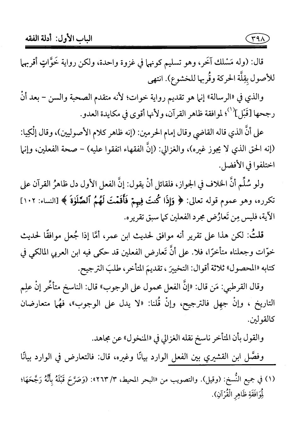 على أنَّ الذي قاله القاضي وقال إمام الحرمين: (إنه ظاهر كلام الأصوليين)، وقال إلْكِيا: (إنه الحق الذي لا يجوز غيره)، والغزالي: (إنَّ الفقهاء اتفقوا عليه) - صحة الفعلين، وإنما اختلفوا في الأفضل.