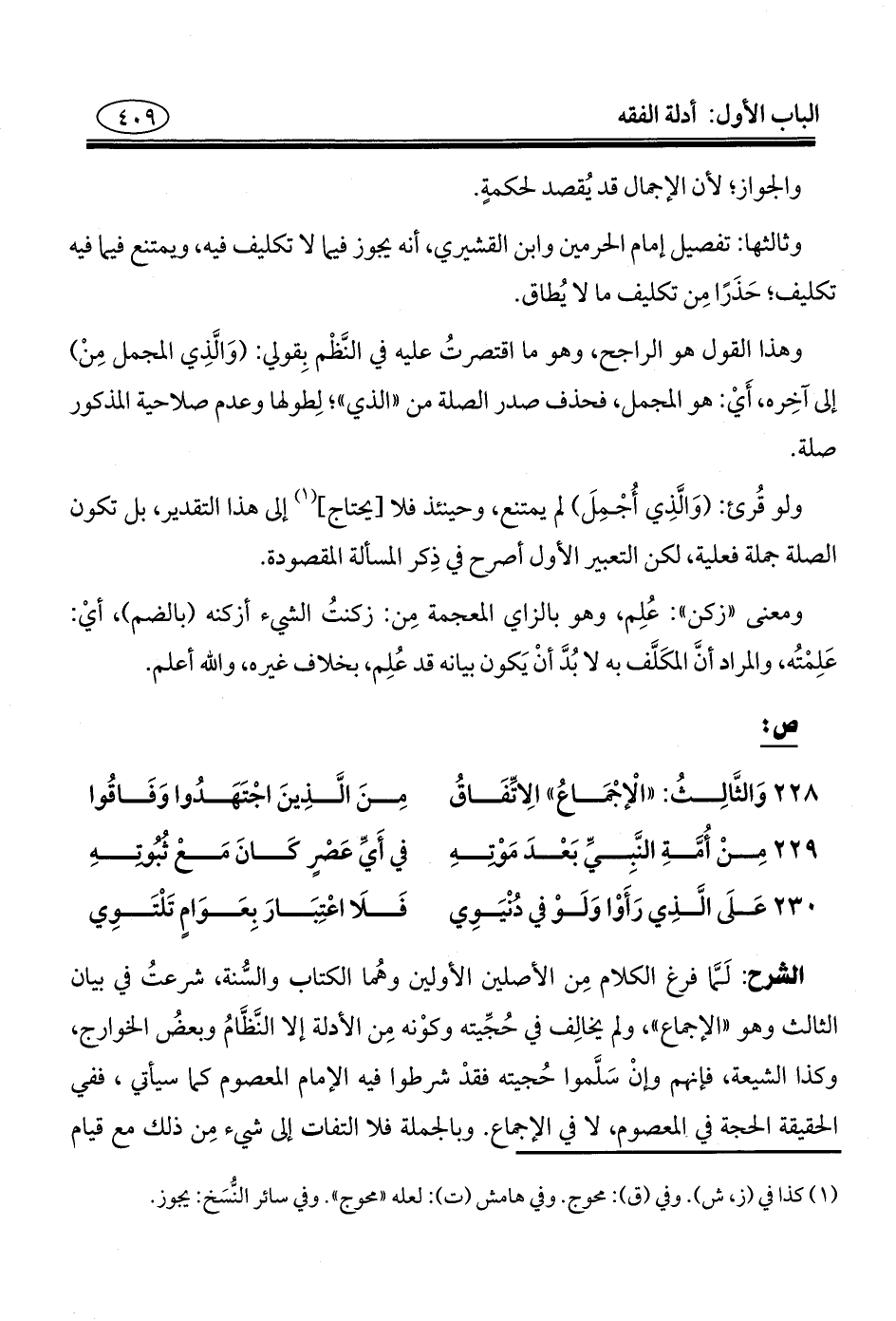 الشرح: لَمَّا فرغ الكلام مِن الأصلين الأولين وهُما الكتاب والسُّنة، شرعتُ في بيان الثالث وهو"الإجماع"، ولم يخالِف في حُجِّيته وكوْنه مِن الأدلة إلا النَّظَّامُ وبعضُ الخوارج، وكذا الشيعة، فإنهم وإنْ سَلَّموا حُجيته فقدْ شرطوا فيه الإِمام المعصوم كما سيأتي، ففي الحقيقة الحجة في المعصوم، لا في الإجماع. وبالجملة فلا التفات إلى شيء مِن ذلك مع قيام