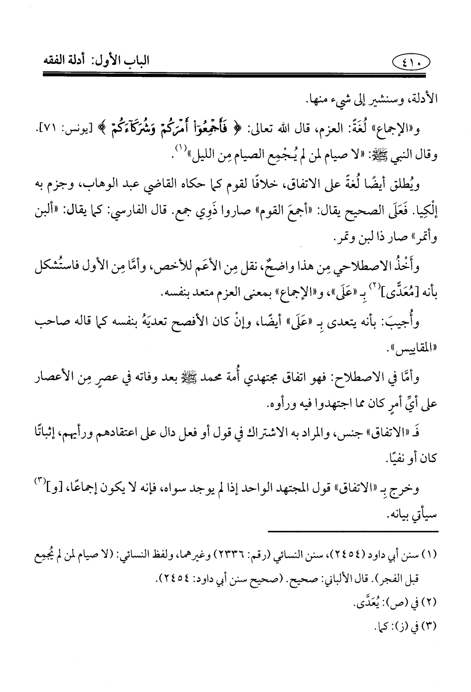 و"الإجماع" لُغَةً: العزم، قال الله تعالى: {فَأَجْمِعُوا أَمْرَكُمْ وَشُرَكَاءَكُمْ} [يونس: ٧١]. وقال النبي - صلى الله عليه وسلم -: "لا صيام لمن لم يُجْمِع الصيام مِن الليل" (¬١).