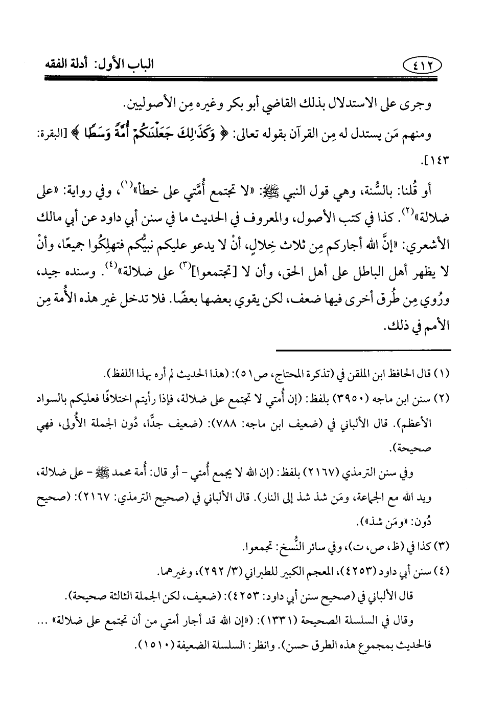 (¬٢) سنن ابن ماجه (٣٩٥٠) بلفظ: (إن أُمتي لا تجتمع على ضلالة، فإذا رأيتم اختلافًا فعليكم بالسواد الأعظم). قال الألباني في (ضعيف ابن ماجه: ٧٨٨): (ضعيف جدًا، دُون الجملة الأُولى، فهي صحيحة).