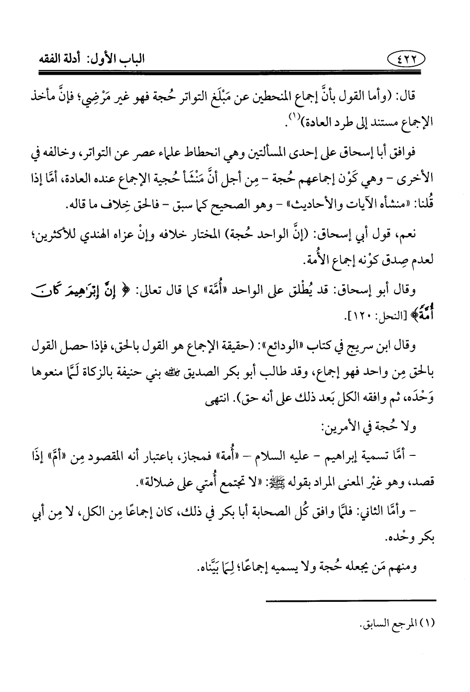 فوافق أبا إسحاق على إحدى المسألتين وهي انحطاط علماء عصر عن التواتر، وخالفه في الأخرى -وهي كَوْن إجماعهم حُجة- مِن أجل أنَّ مَنْشَأ حُجية الإجماع عنده العادة، أمَّا إذا قُلنا: "منشأه الآيات والأحاديث" -وهو الصحيح كما سبق- فالحق خِلاف ما قاله.