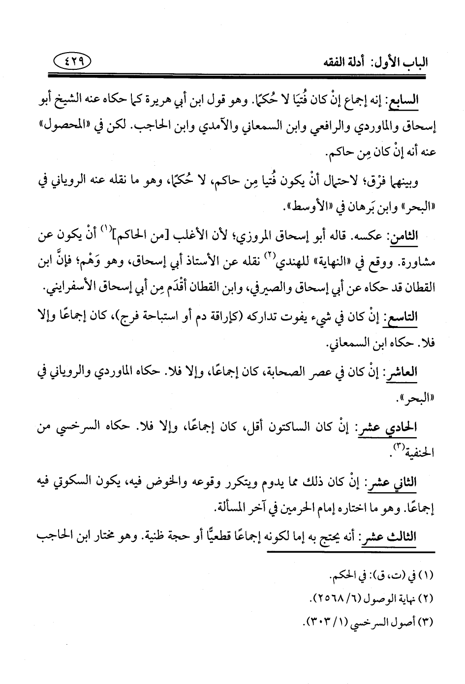 الحادى عشر: إنْ كان الساكتون أقل، كان إجماعًا، وإلا فلا. حكاه السرخسي من الحنفية (¬٣).